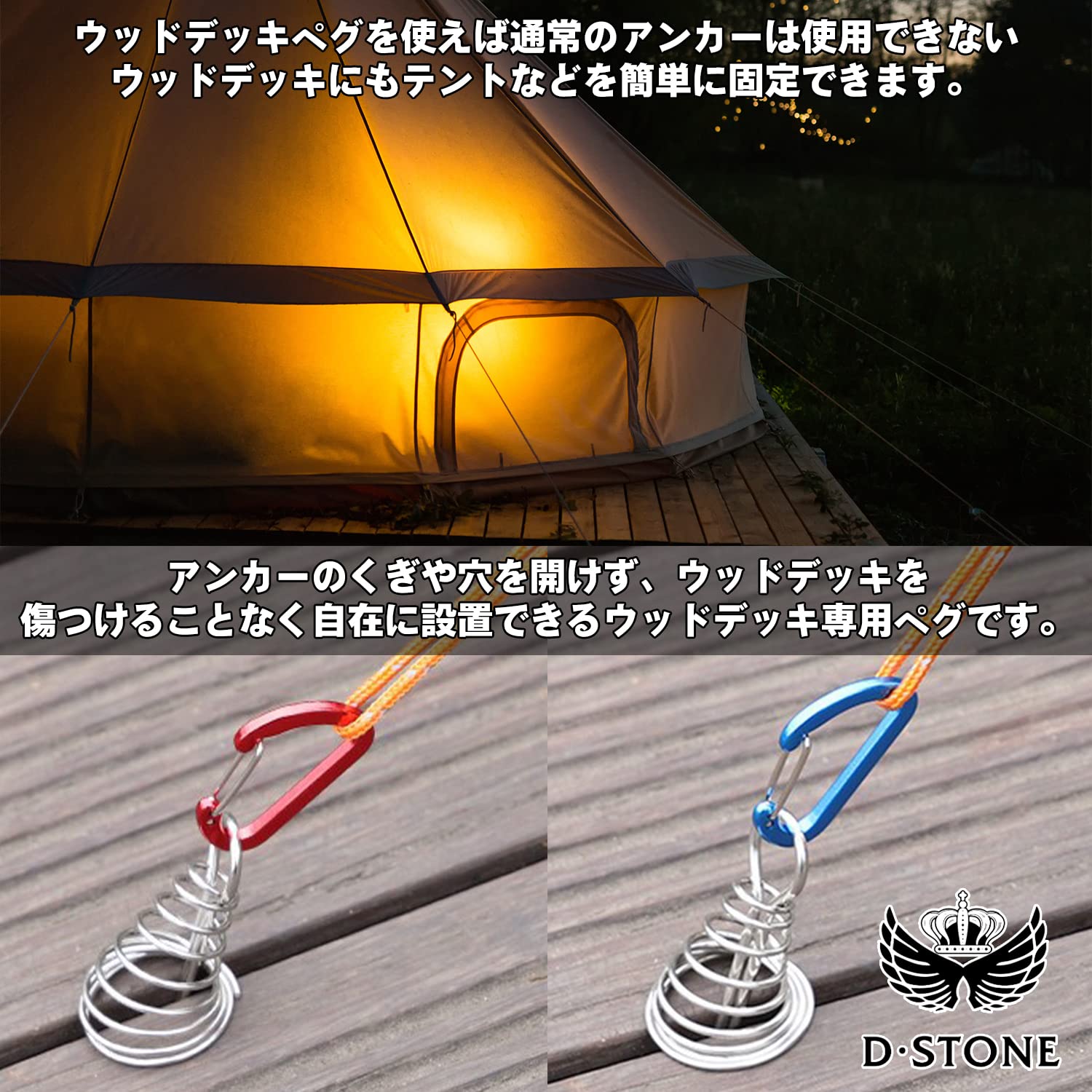 【新着商品】D・STONE アンカー ペグ デッキペグ ウッド デッキ テントクリップ パラソルタープ キャンプ 自在 金具 留め具 対応