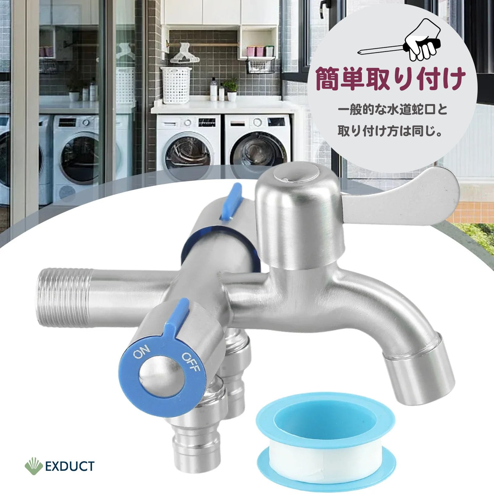 【在庫処分】EXDUCT 3分岐蛇口 洗濯機用水栓 3分岐止水栓 ステンレス製 三股蛇口 標準G1/2 洗濯 お風呂 洗面所 浴室 ベランダ ガーデン 3口 蛇口