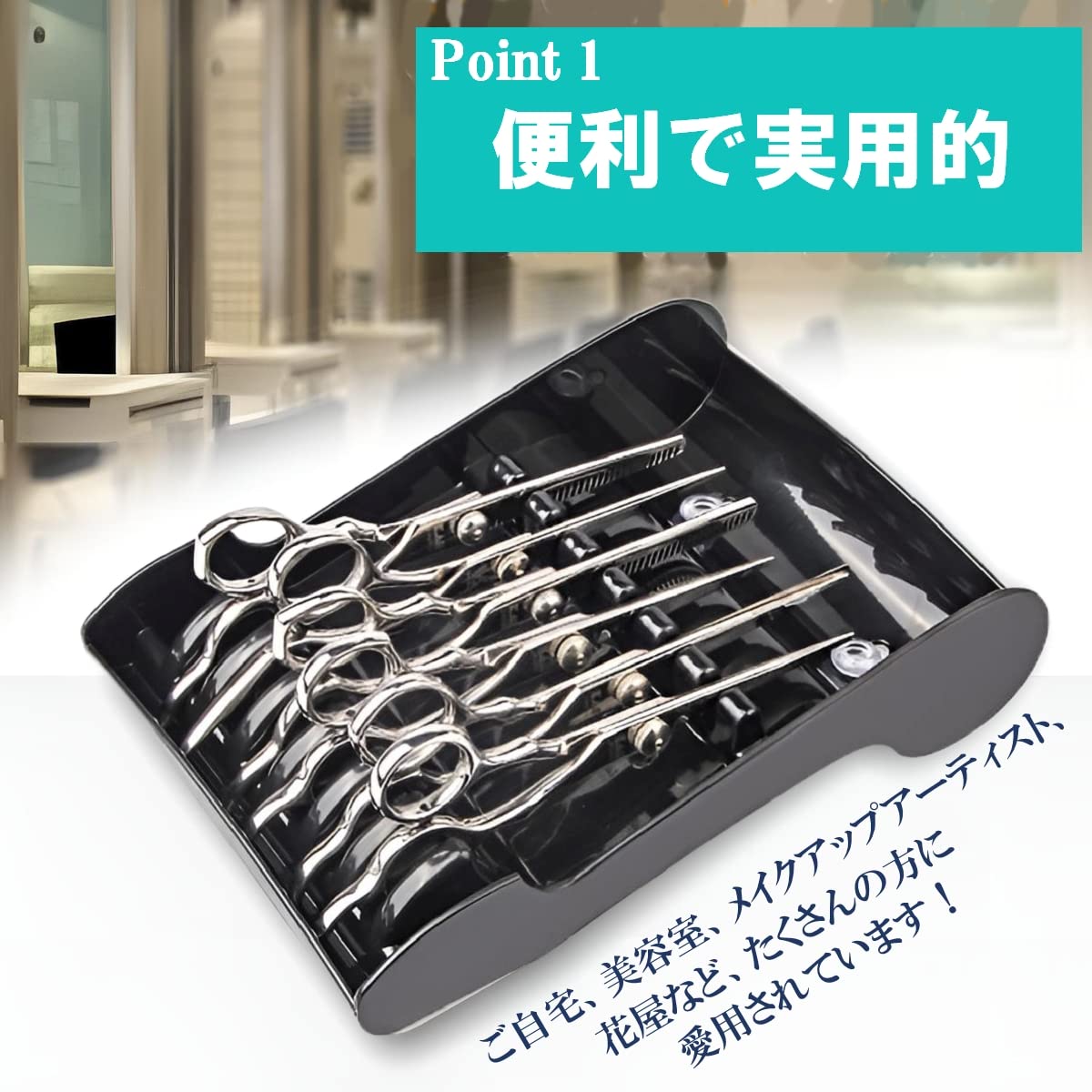 【軽量でコンパクト】トレイのなかに6〜8本のハサミを収納することが可能。滑り止めの吸盤がしっかり固定するのでどんな場所にでも置くことができます。(※吸盤がくっつかない場所もあります) 腰に付けるシザーケースよりも完全に見えるトレイケースなので仕事の効率も上がること間違いなし。