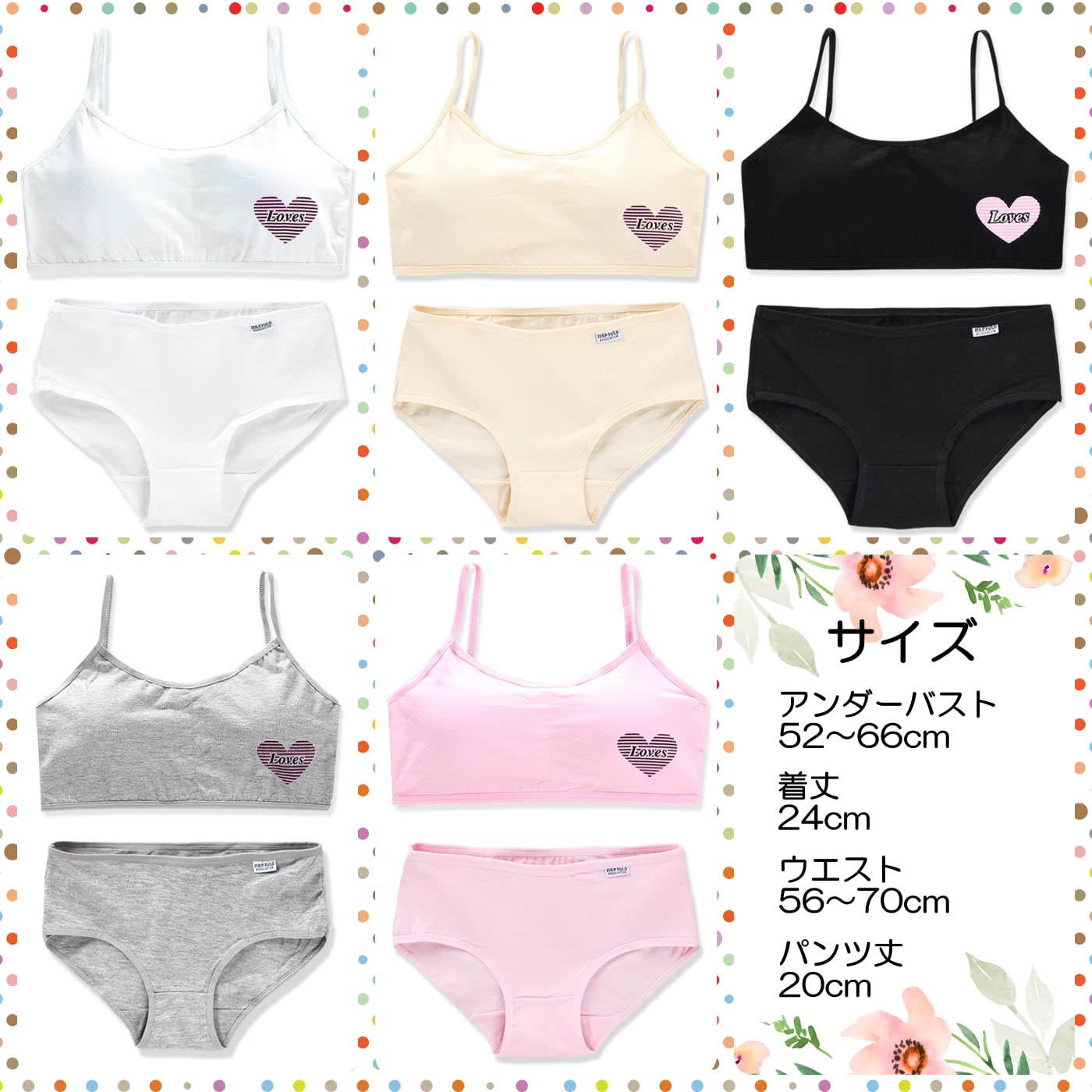 デザイン:シンプルでガーリーなデザインで、ハートマークがかわいらしくおしゃれに決まります。3色の上下セットで、おしゃれなキャミタイプデザインがポイントです。
