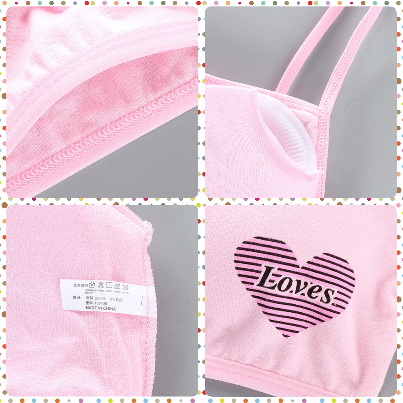 機能性:通気性が良く柔らかな肌触りで、お肌に優しく快適な着心地。パット入りで安心のファーストブラにおすすめです。取り外し可能なカップが付いており、着脱も簡単です。