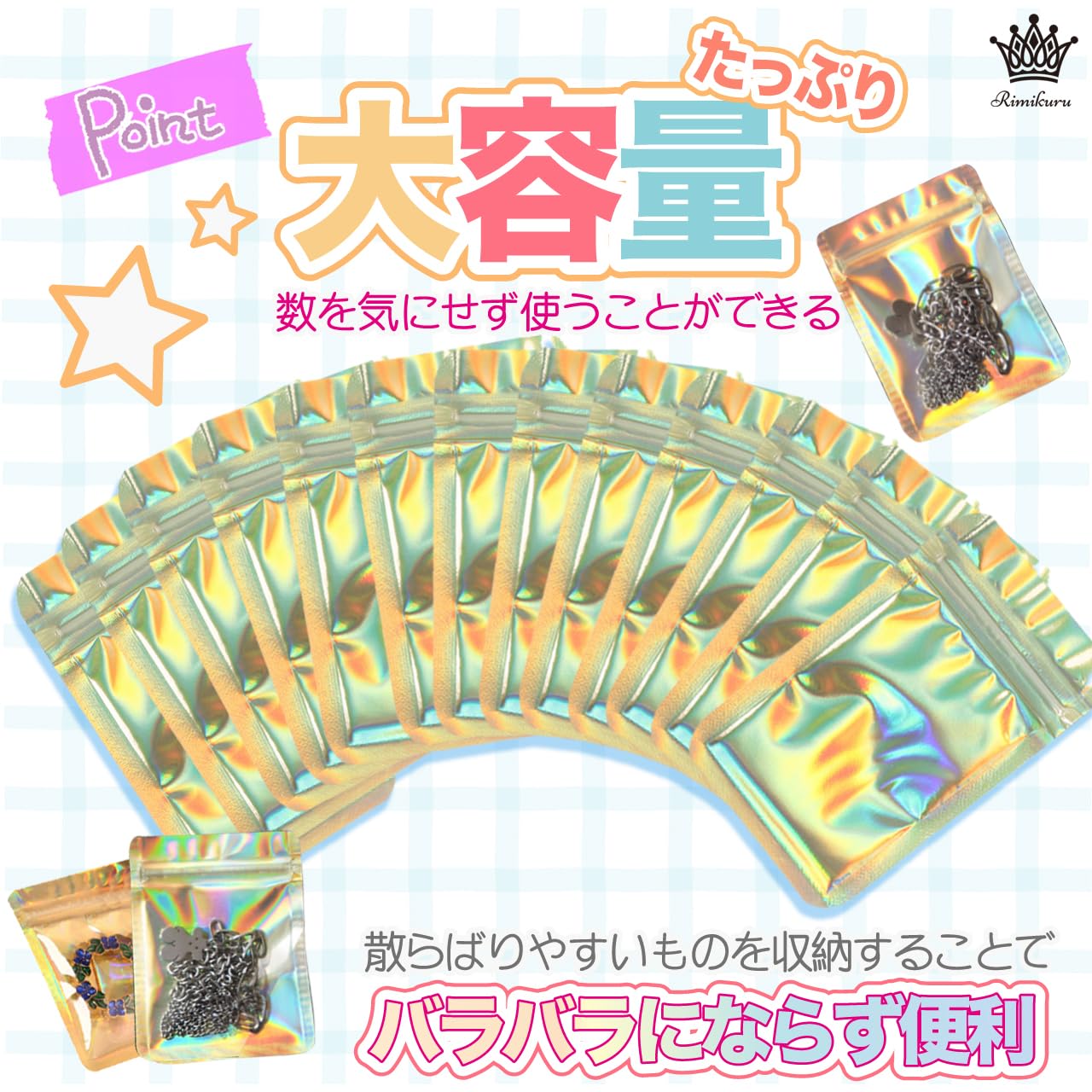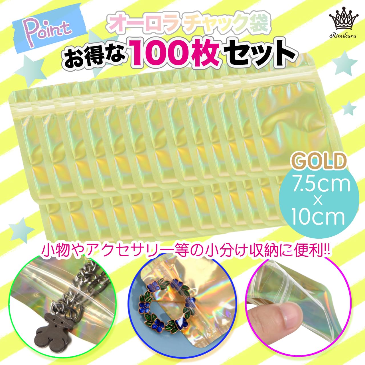 Rimikuru オーロラ チャック 袋 アルミ袋 チャック付き袋 100枚/200枚セット ゴールド ミニ ジッパー付き袋 厚手 小さい (7.5cm×10cm・100枚セット)