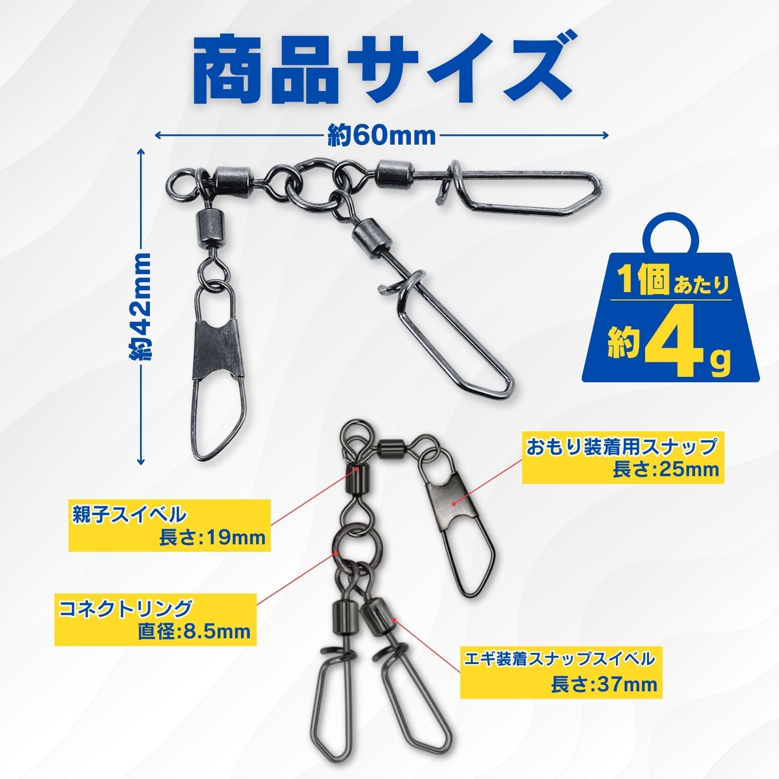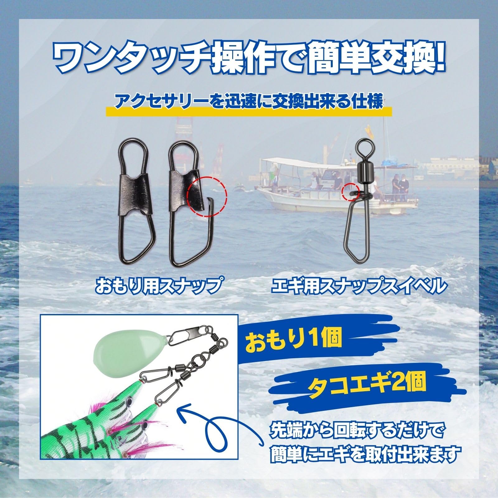 【ダブル仕様】強力なタコエギスナップ強力な強度: 高強度仕様で、船釣りや、陸っぱりでのバラシを軽減。サルカンやスイベルとしても利用可能で、様々な釣りシチュエーションに対応します。