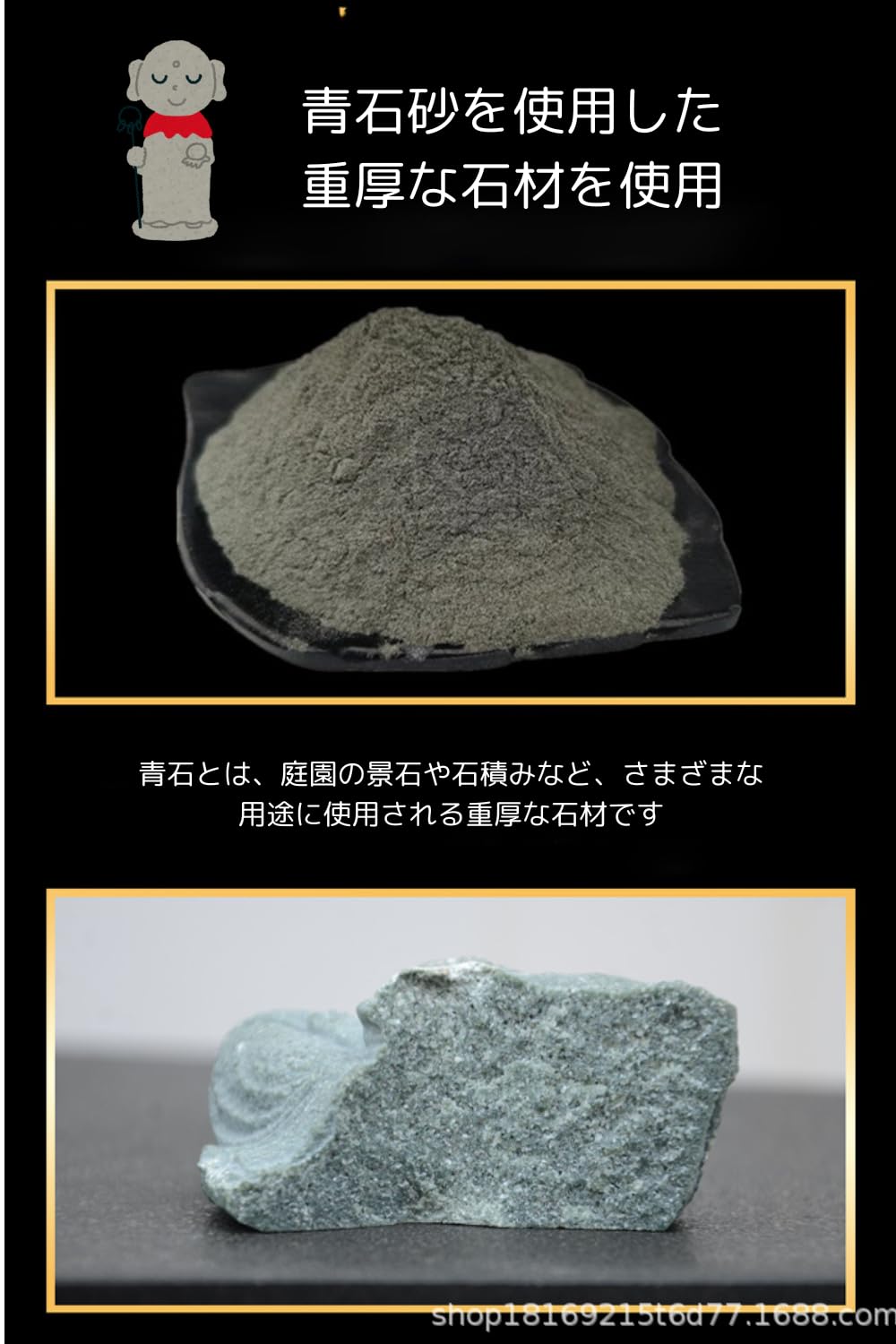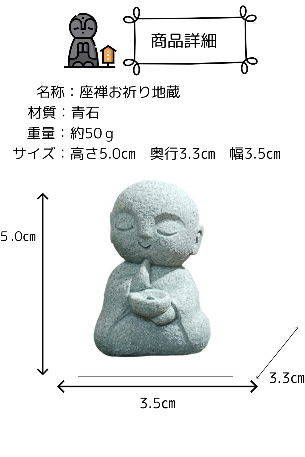 可愛らしいお地蔵さんの置き物です。高さ約6cmの掌サイズ。青石砂を使用した重厚な石材製で、お部屋のオーナメントやガーデンオーナメント、アクアリウムにも適しています。