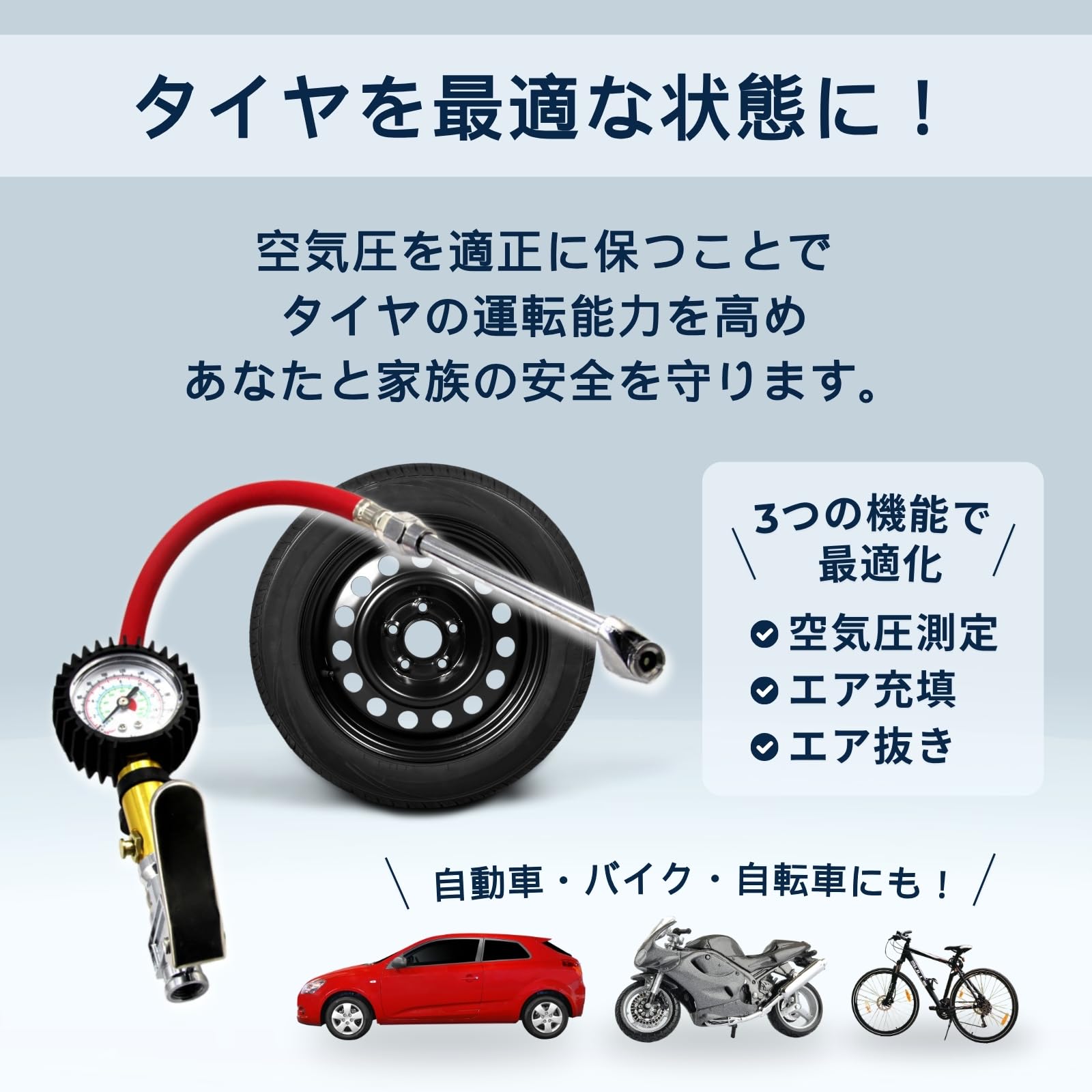 エアゲージ(黒)【高精度タイヤ空気圧計 - 車両全般に対応】車両のタイヤ管理がこれ一台で簡単・確実に!高精度なタイヤ空気圧計で、車のパフォーマンスを最適な状態に保ちます。自転車、バイク、自動車、トラックまで幅広い対応範囲で、正確で安全な運転を実現します。 【特長一覧】◆正確/簡単/安全: メカニカルダイヤルとムーブメントにより、正確な測定が可能。エアホースと厚手のゴム製スリーブで保護され、長寿命を実現。◆範囲広い測定: 測定範囲10-220psi/0-15bar/0-1500 kPaで、様々な車両に対応。米式バルブにも対応しています。◆多彩な機能: ロングノズル、合金ハンドル、ダブルヘッド、減圧バルブなど、各部の特長的な設計で使用が簡単で効率的。◆安心の耐久性: 防食、滑り止め、耐摩耗性を持つ合金ハンドルや防食性ゴム製プロテクタなどが付属。長い寿命をします。◆測定範囲: -20 ~ 70 ℃の広い使用温度範囲で活躍。◆接続便利: コネクタ仕様は1/4 nptクイックコネクトオスコネクタ入力、出力ポートはG1/4。