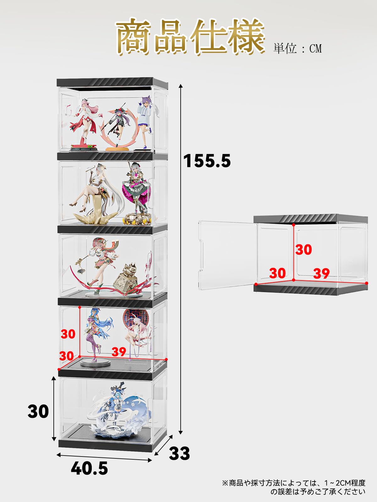 【商品詳細】 外寸サイズ:横幅40.5×奥行33×高さ155cm、内寸サイズ(1段):横幅39cm×奥行30cm×高さ30cm。高さ25cm(1/8と1/7スケール)ぐらいのフィギュアに適したサイズです。ケースの大きさがディスプレイの効果に影響を与えますので、ご購入前にぜひサイズをご確認ください。