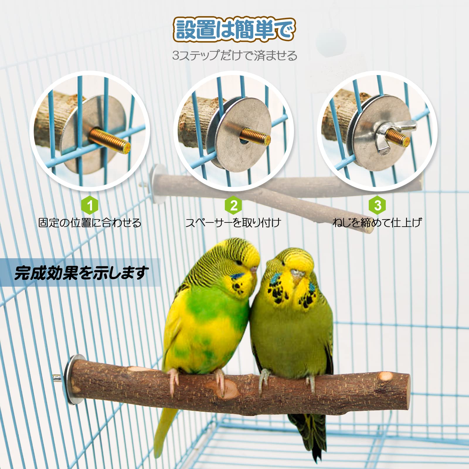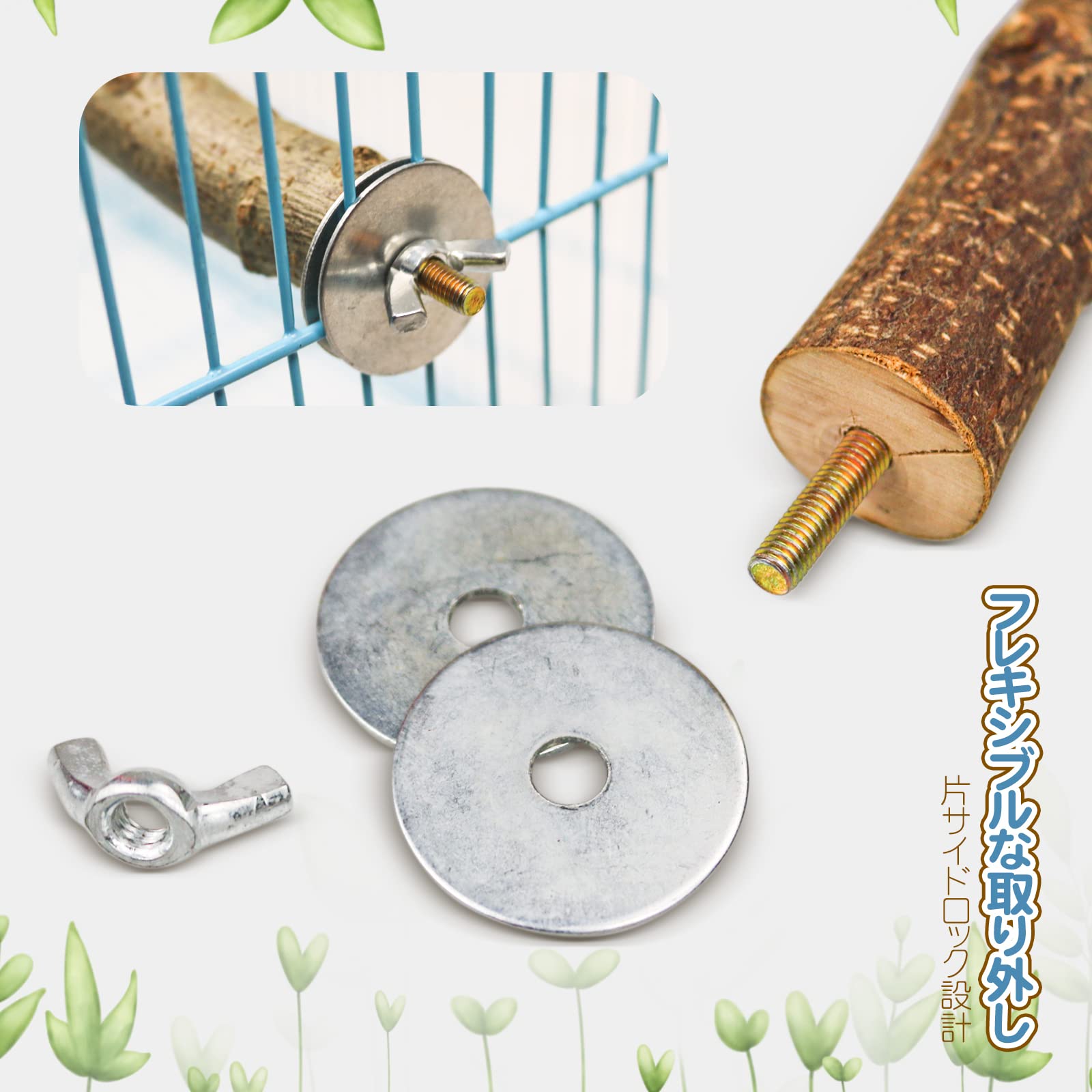 ??取り付け簡単:各ブドウのイカは金属の蝶ナットおよび作り付けのボルトが装備されている。設置に追加の機器は必要なく、しっかりと固定できます。簡単にケージに設置できます。平らなパーチなので小鳥の寝床としてもご利用いただけます。