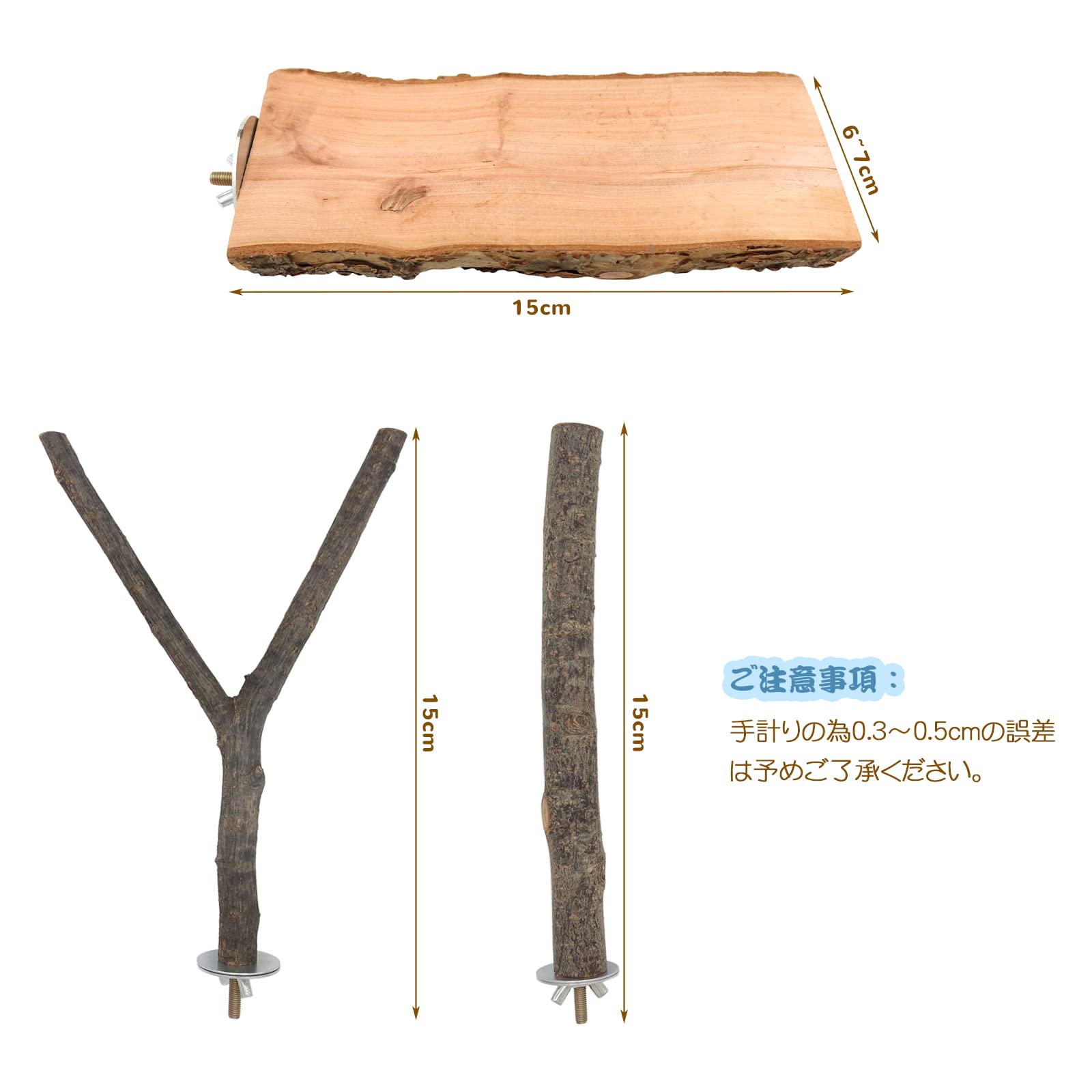 ??サイズ:止まり台:幅6-7cm、長さ15cm、Y型止まり木:長さ15cm、枝の直径は1.5-2.5cm(太い部分)です。I型止まり木:長さ15cm、枝の直径は1.5-2.5㎝です。