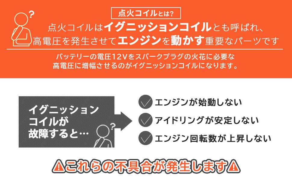 バッテリーの電圧12Vをスパークプラグの火花に必要な高電圧に増幅させるのがイグニッションコイルになります。イグニッションコイルが故障すると症状として、エンジンが始動しない、アイドリングが安定しない、エンジン回転数が上昇しない等が発生します。