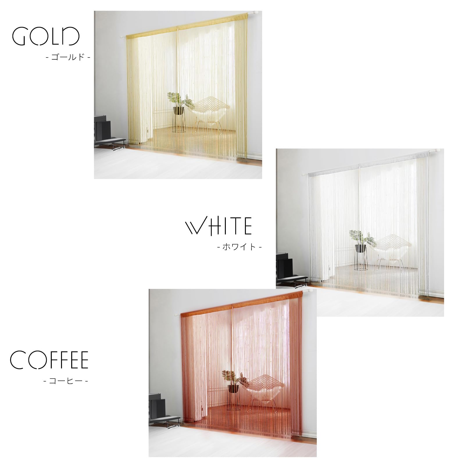 サイズは幅1m × 2枚で合計2m、カラーはシャンパンゴールド、ホワイト、ダークコーヒーの3色をご用意。ひものれん 170は、洗面所やキッチンなどの水まわりにも適しており、換気をしながらプライバシーを守ることができます。