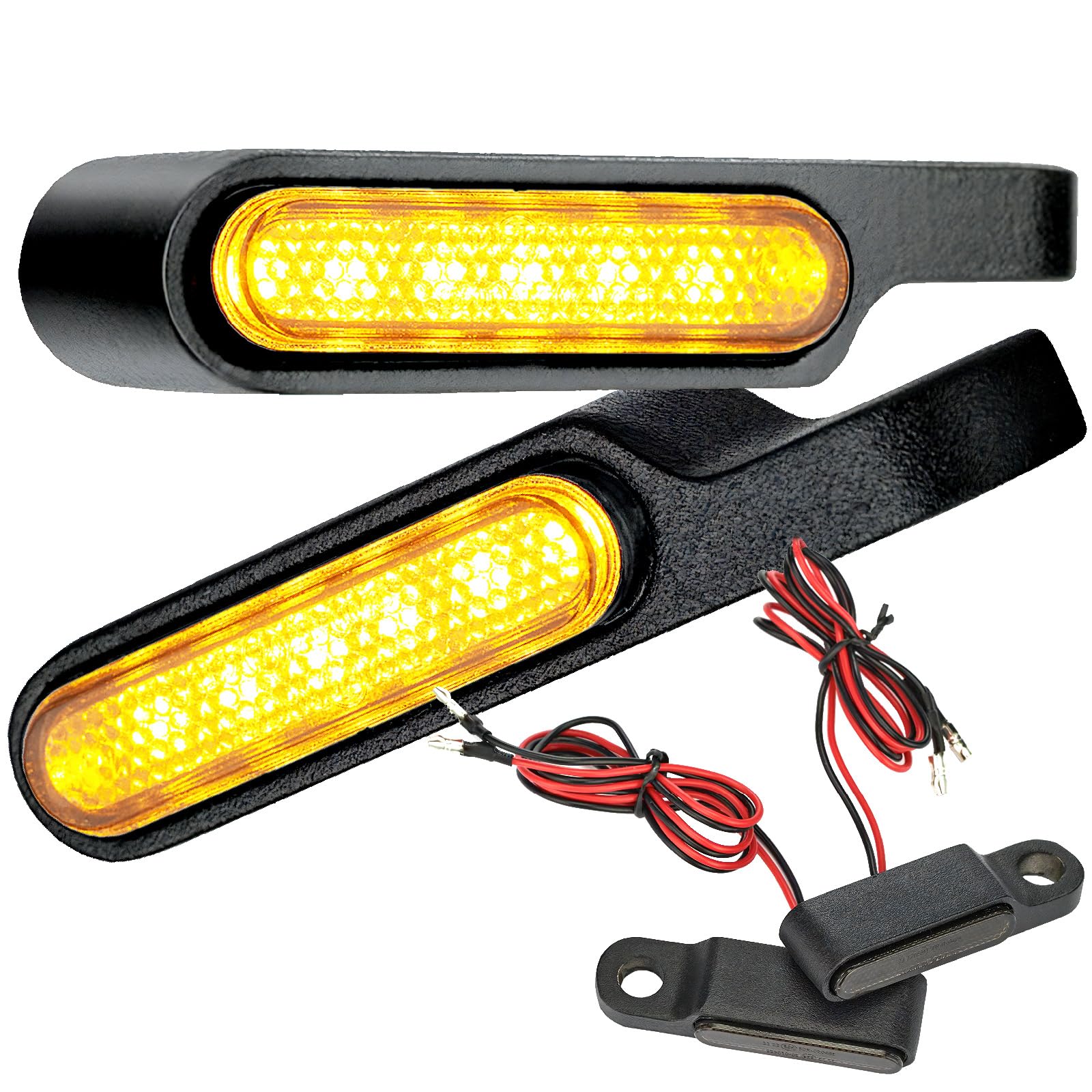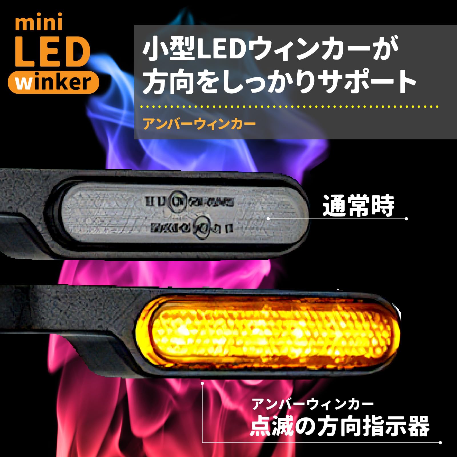 アメリカン、オフロード、クラシック、スクーター、スポーツ、ネイキッドなどバイクの種類を選ばない汎用デザイン。流れるウィンカーと、ウインカーポジションのホワイトがオシャレ。コンパクトサイズなミニウインカーでバイクをクールにドレスアップ。