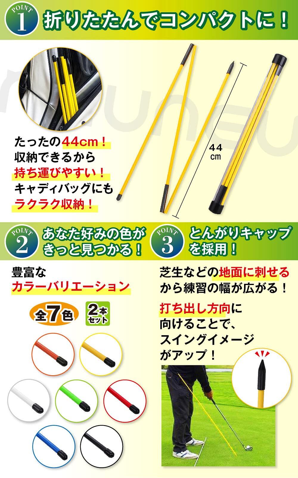 ?【 練習 の幅が広がる 】 正しい姿勢ボールのアライメント、クラブのアライメント、最適なインパクトを達成するための スイングプレーン を確認します。 アライメント スティック の先端にとんがりキャップを採用し 尖っているため地面に刺して使うことができ スイング や ボディワーク など様々な 練習 ができるので アイディア次第で練習の幅が広がります。 アライメントスティック は ビギナー から ツアープロ まで必携の 練習器具 です。
