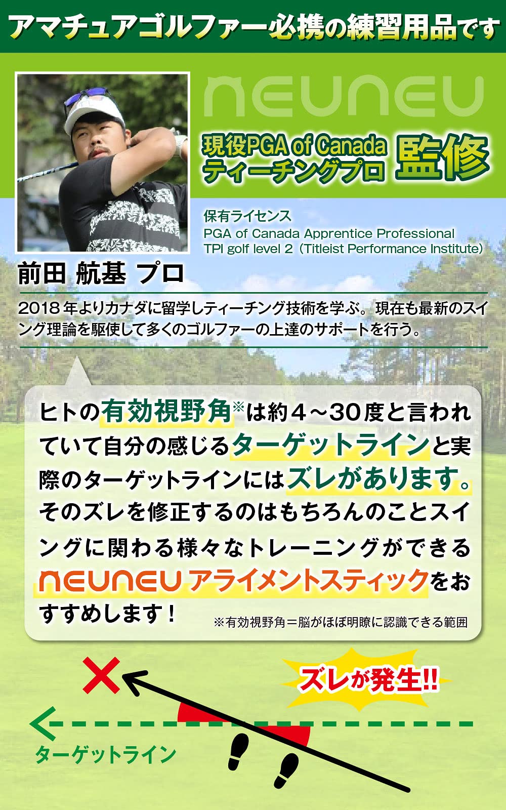 ?【 方向性 のお悩み解決 】 neuneu の アライメントスティック は PGA of Canadaティーチングプロ監修!! 方向性のお悩みに 効果がわかる ゴルフ練習器具 です。 毎回のアドレス で完璧な アライメント を保つことができ、さらに あなたの ゴルフ の色々なお悩みを解決して スコアアップ に役立ちます。