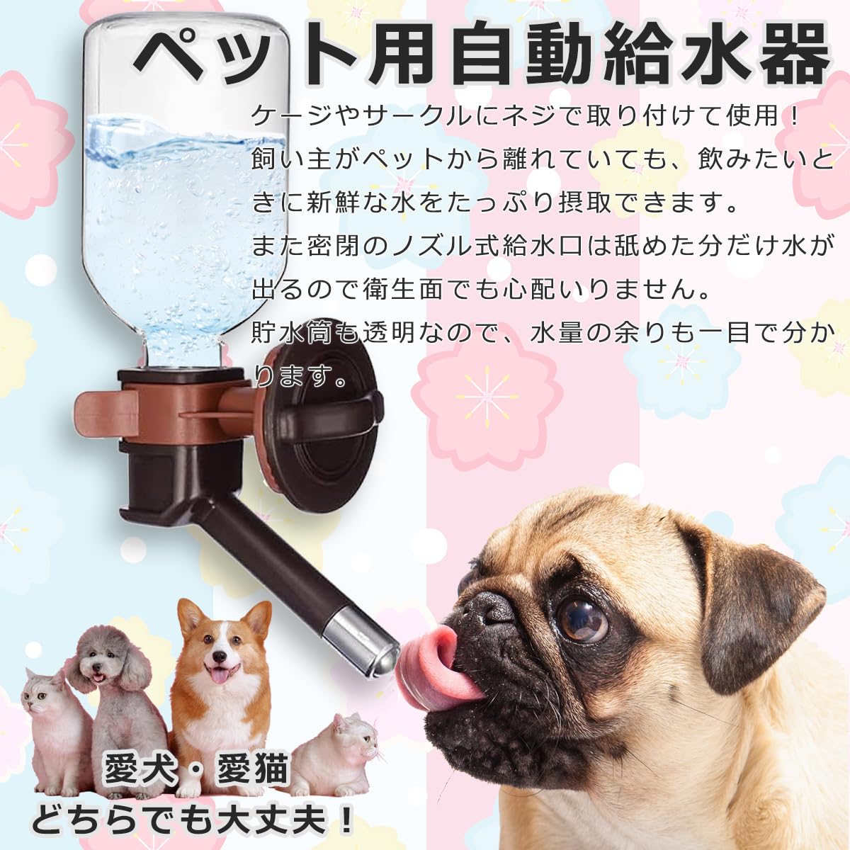【在庫処分】LovesPet 軽量 自動給水 ペットボトル 水漏れ軽減機能付 ゲージ かんたん取付 清潔 ペット用品 犬猫 ウォーターノズル 小動物にも対応