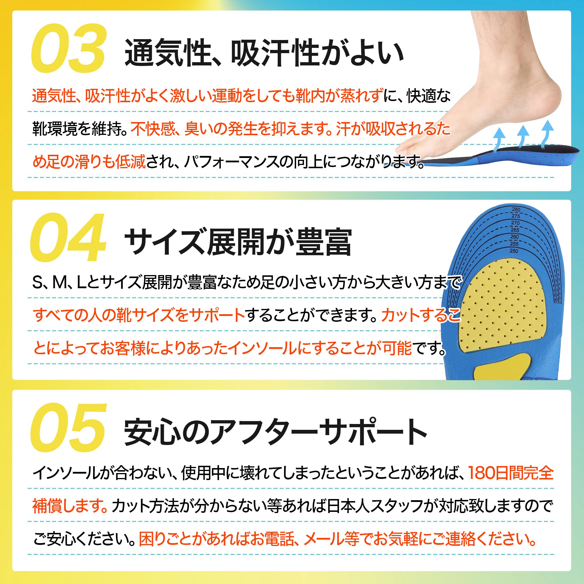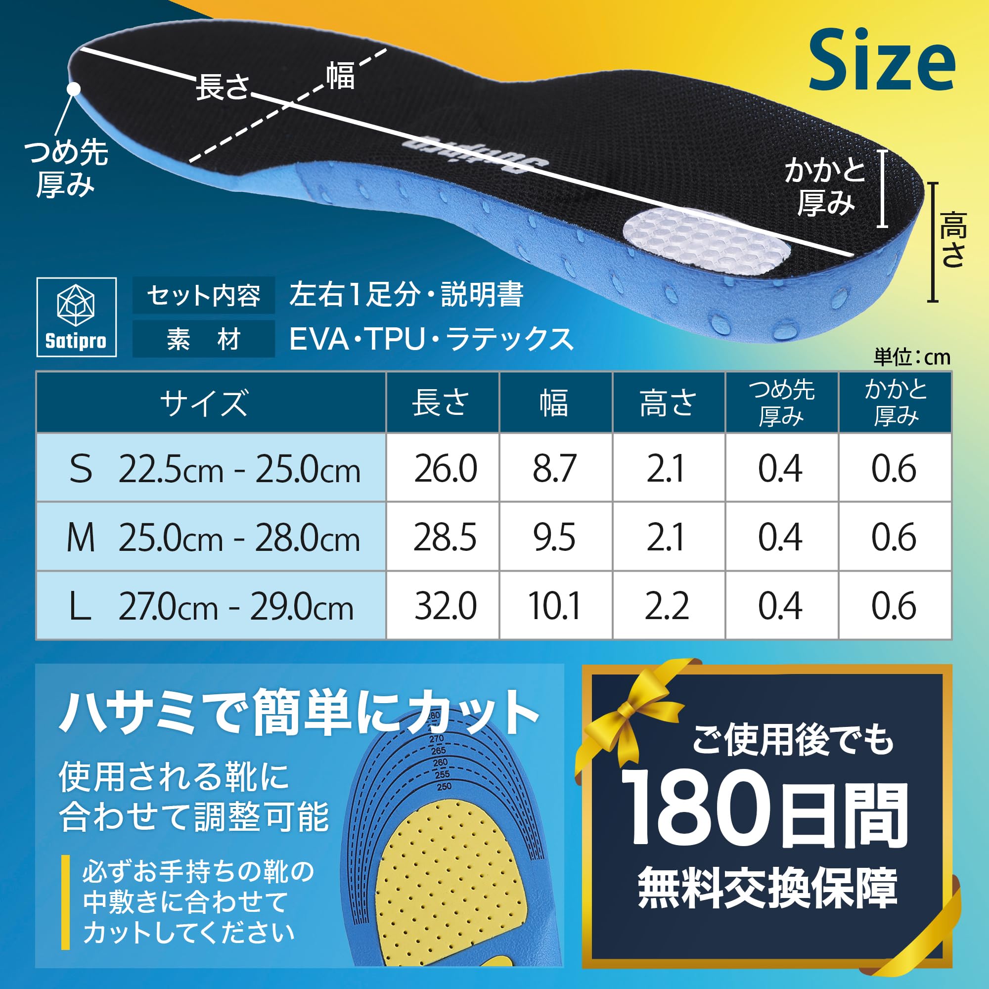 【3サイズ展開/ハサミで調整可】Sサイズ(22.5cm〜25.0cm)、Mサイズ(25.0cm〜28.0cm)、Lサイズ(27.0cm〜29.0cm)の幅広いサイズ展開。男性でも女性でもご使用いただけます。ハサミで簡単にカットできるので、使用される靴に合わせて調整できます。