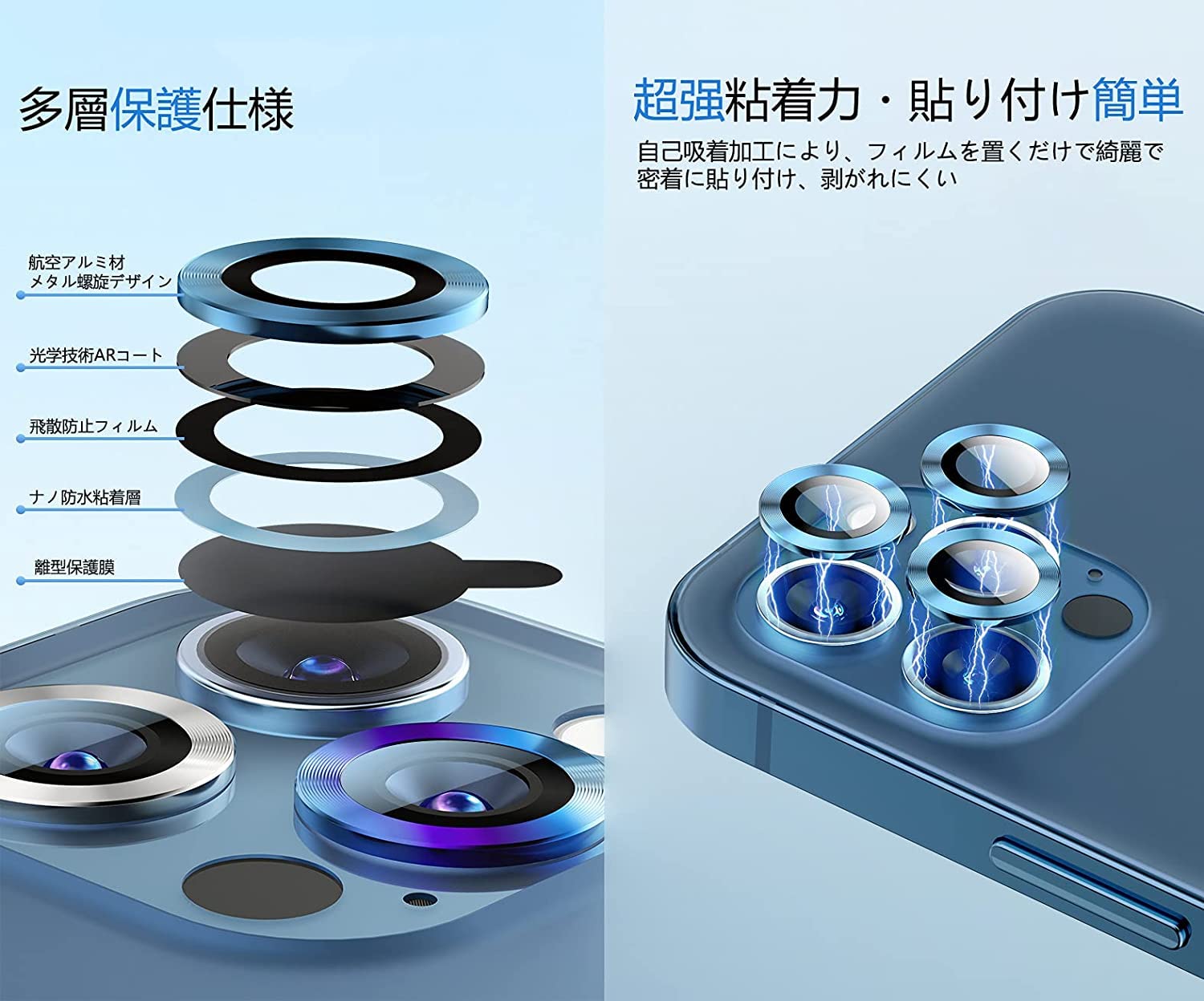 【指紋防止・気泡ゼロ・貼付け簡単】強化ガラスカメラフィルムの表面は指紋防止コーティングが加工されるため、指紋が付きにくく、汚れが付いても布で拭くだけできれいになります。保護シールを剥がし、レンズの位置を合わせて上から軽く置くだけで気泡が入ることなく簡単に貼り付けられます。