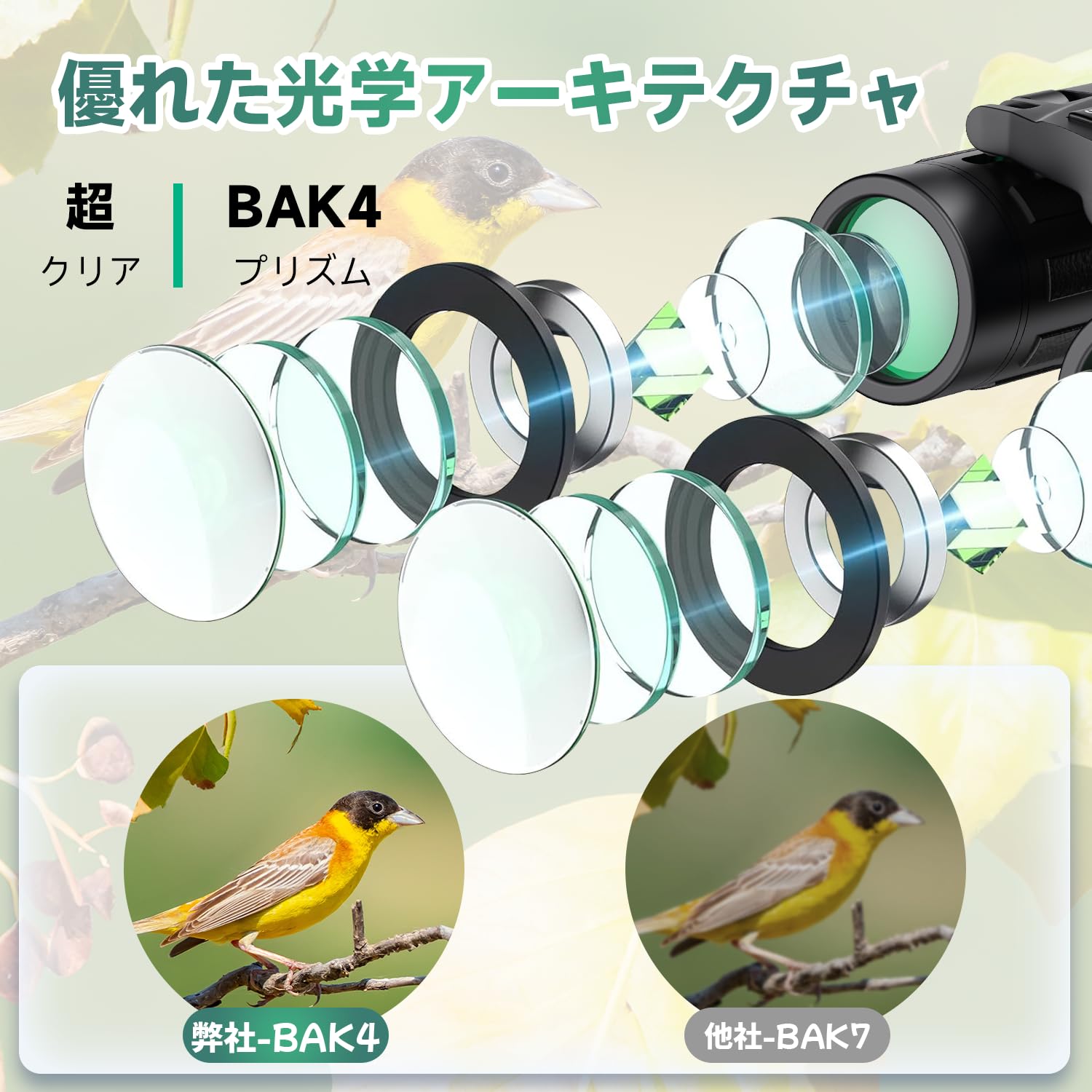 【BAK4光学レンズとFMC多層コーティング】最新のBAK4光学レンズは、光の散乱を効果的に低減し、画像の鮮明さと色再現を向上させ、低照度環境でも明るく低ノイズの画像を表示できるため、観察体験がより快適になります 。大口径設計により光の取り込み量が大幅に増加し、光透過率は最大99.5%に達し、全反射機能により薄暗い環境や夜間でも良好な視界を提供します。夕暮れや夜の自然観察や天体観察に最適です。誰でも使える双眼鏡です。
