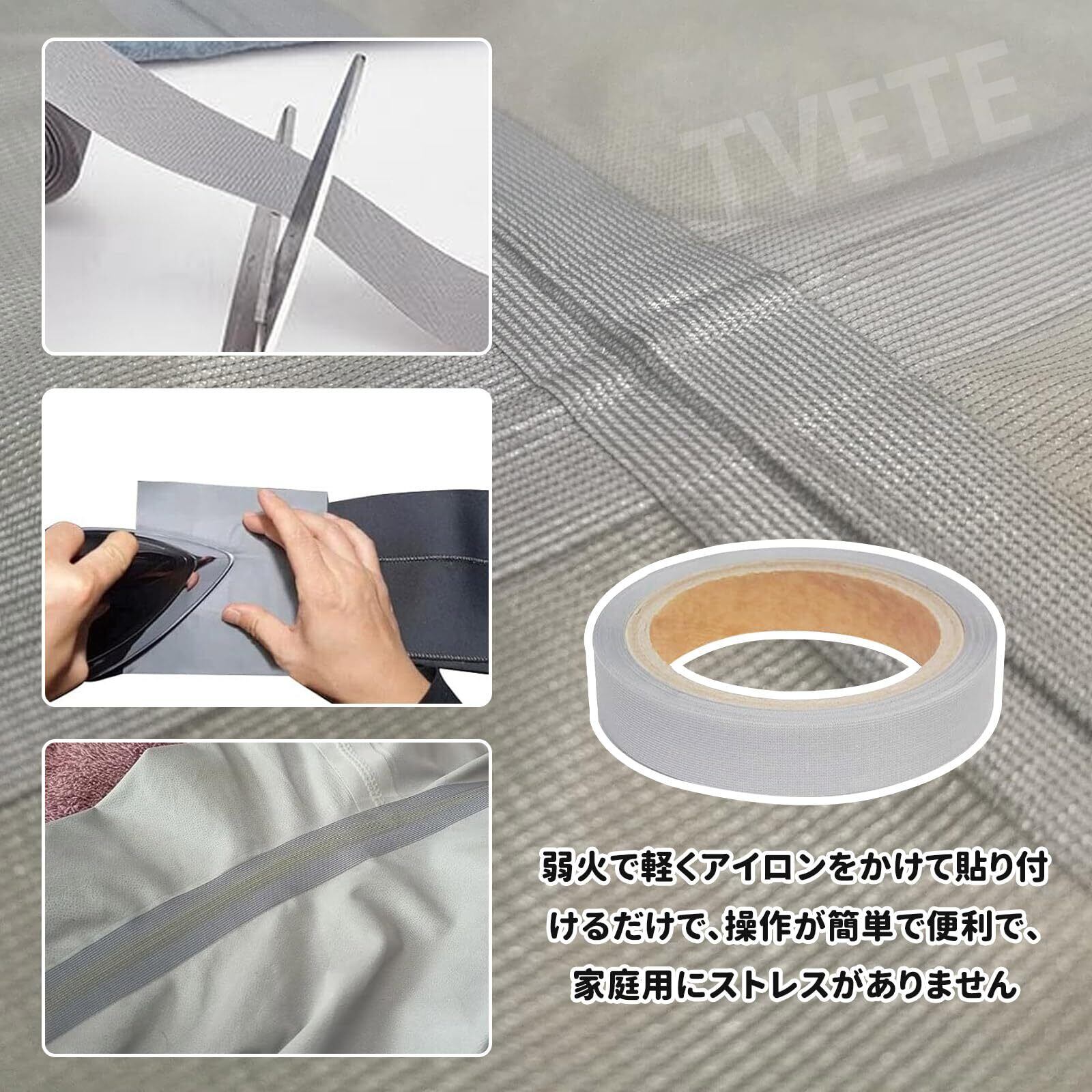 【使用方法】生地の汚れを落とし、当て布を当ててアイロンはドライ設定、低中温程(10〜20秒目安)で作業をしてください。熱圧着後、冷める時に接着が強まります。強く接着するとテープの脇から透明な糊がはみ出ます。作業環境が違う為、時間温度調整等をお願いいたします。