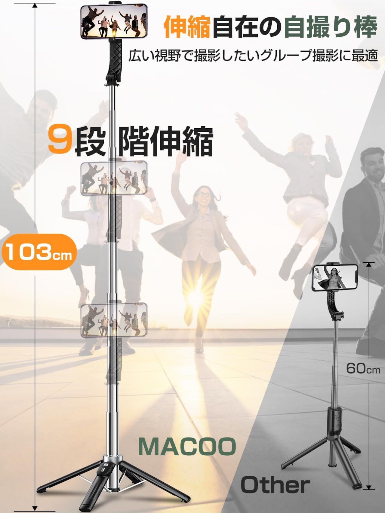 【コンパクトながら広い撮影範囲】お客様のご要望にお応えし、安定性を追求しつつも、サイズも極限まで小さくしました。自撮り棒は家から持ち出して使うことが多いアイテムなので、携帯性や撮影範囲も選ぶ際の重要な要素となります。MACOOの自撮り棒は折り畳んだ状態で17.5㎝、500mlのペットボトルよりも小さい、約103cmまで9段階伸縮可能なロングタイプで、家族や友人とのデートの際、いつでも取り出せるようにポケットに入れて、皆様と素敵な瞬間を記録できます!