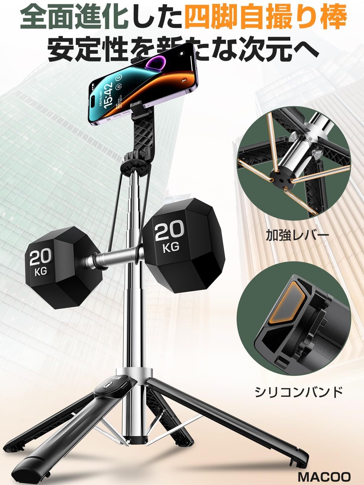【安定性を新たな次元へ】長年にわたり、MACOOは新設計と安定性を一体にした自撮り棒を追求し続けます。業界初「四脚安定モデル」自撮り棒がついに新登場へ!従来の三脚式じどり棒と異なる、安定感が高い「四つ脚」と「加強レバー」を施すことにより、ダブル安定構造で耐荷重が高かったのは20kg、iphone proシリーズや重いカメラなどに接続してもOK!更に底部はシリコンバンドが付き、滑りやすい環境でも、風が吹いていても、不安定な岩場でも安定した撮影ができます。