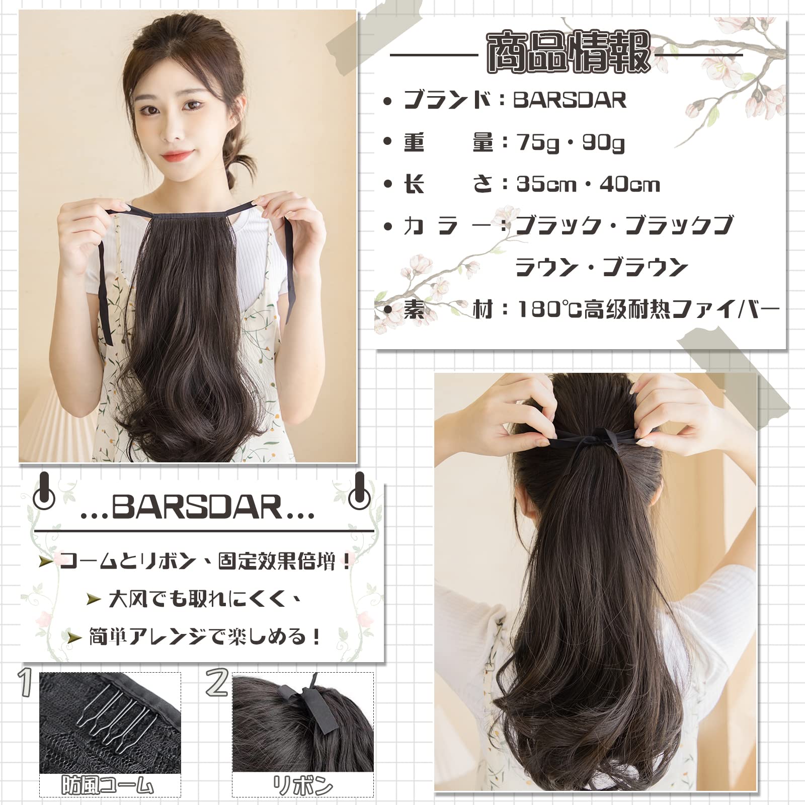 BARSDAR エクステ ポニーテール ウィッグ つけ毛 カール ロング ポイントウィッグ リボン 自然 長さ 35cm 40cm コスプレ 3色選び(ブラック×40cm)