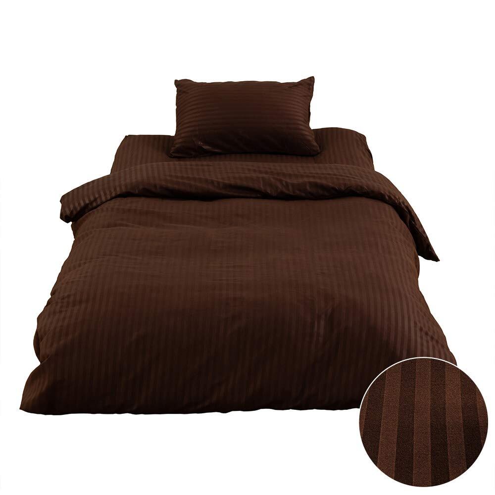 EiYU 布団カバー セミダブル 3点セット(掛け布団カバー ボックスシーツ 枕カバー) ブラウン サテン調ストライプ