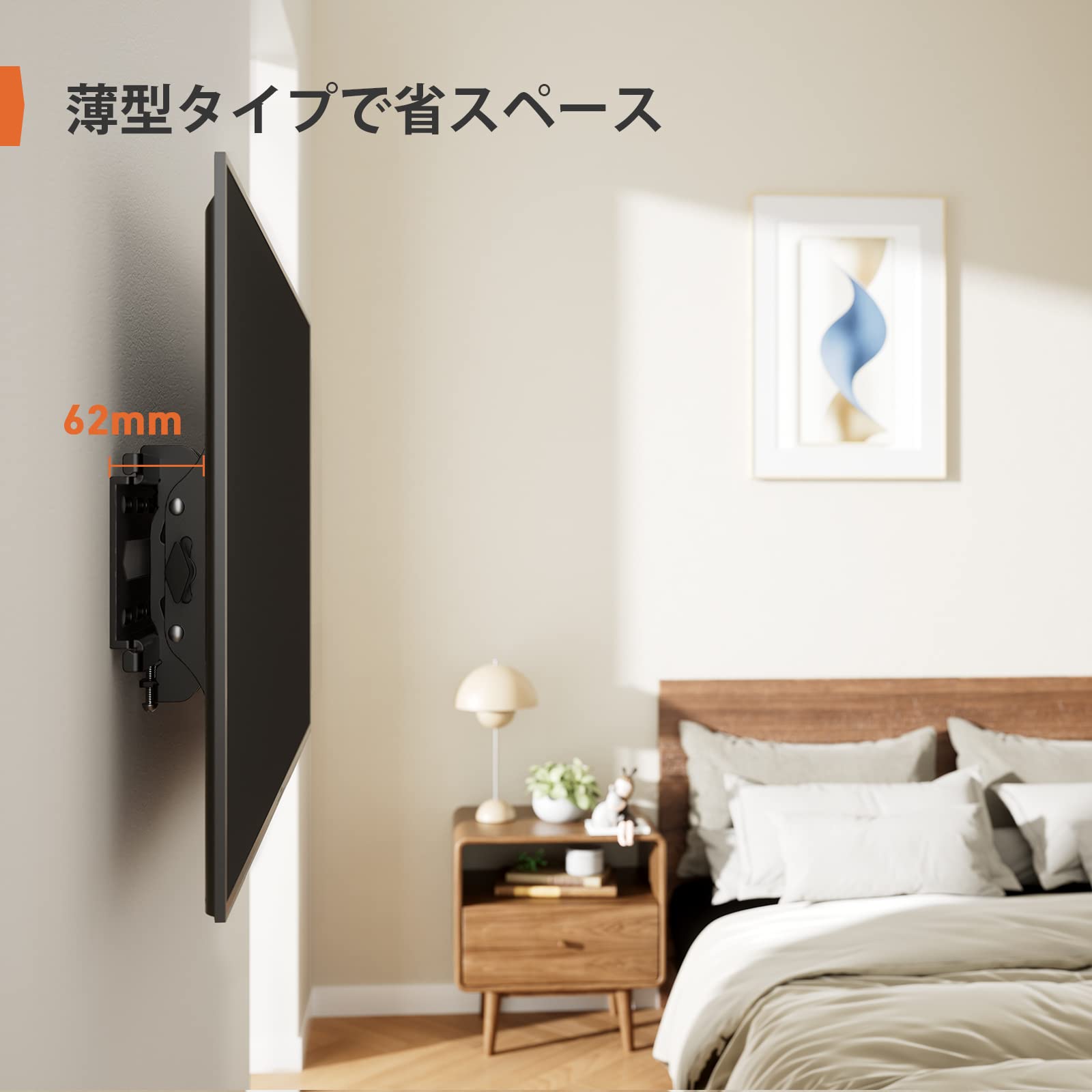 【テレビを壁掛けにしてお部屋すっきり】本薄型テレビ壁掛け金具は、厚みを抑えつつ配線にも配慮した設計で、壁からの距離は最適な62mm。コンセントの抜き差しもスムーズに行えます。薄型・軽量タイプでお部屋を広く見せ、掃除もしやすくなります。モニター壁掛け金具としても使え、スタイリッシュなオフィス空間にも最適です。