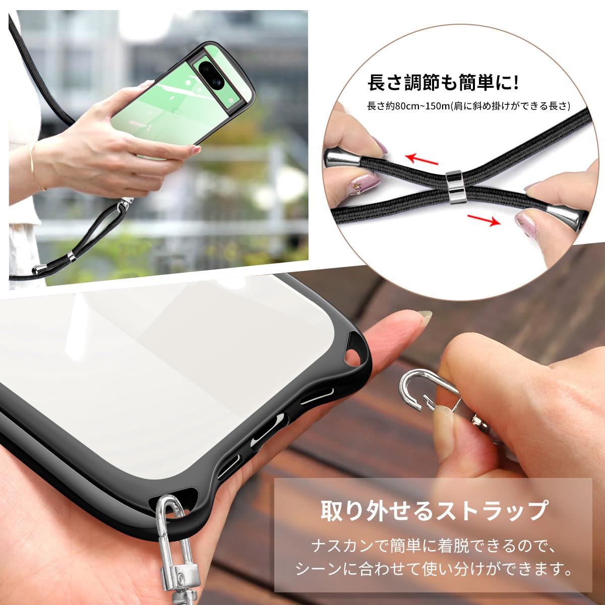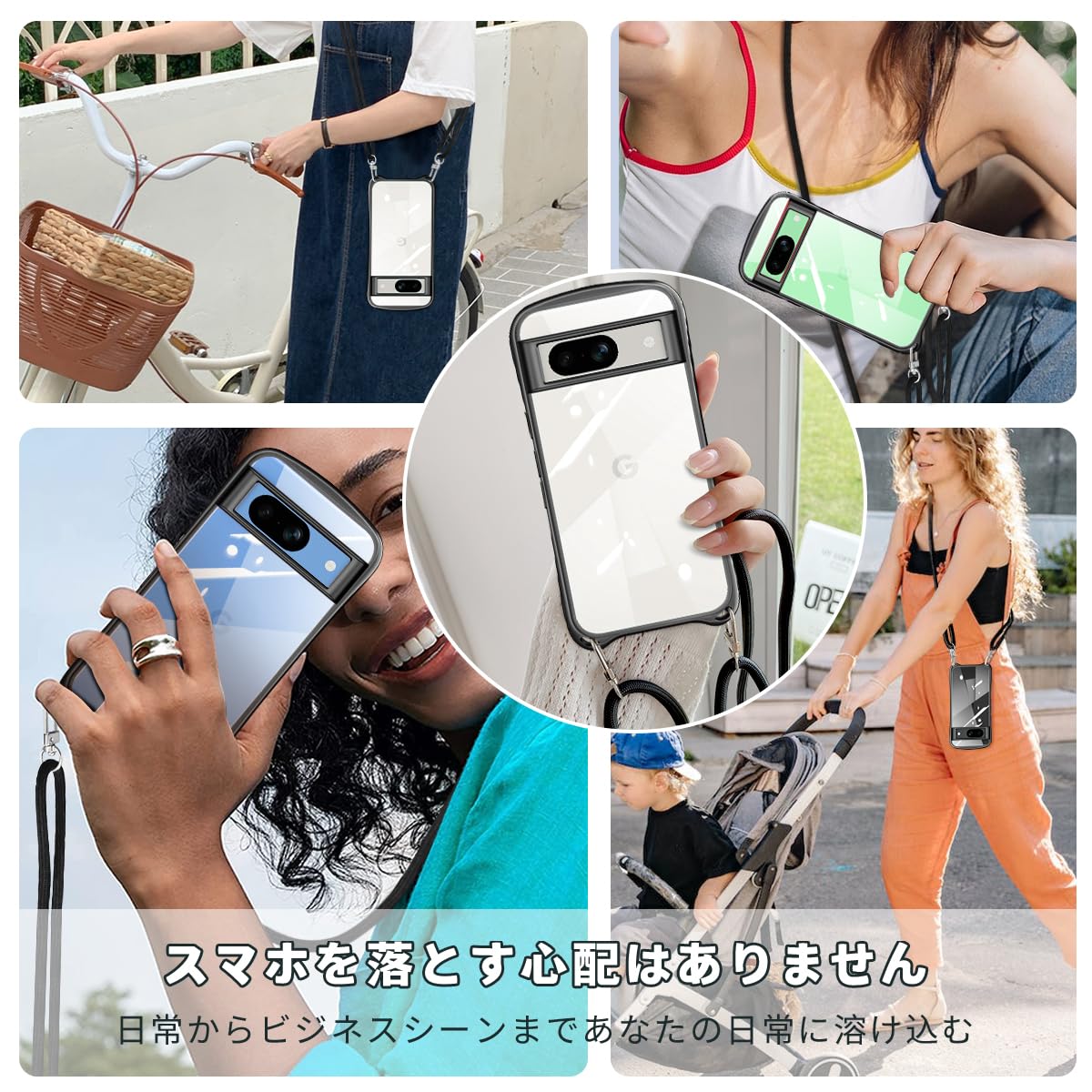 【人気商品】Google Pixel 8a ケース クリア ショルダー ストラップ付き グーグル ピクセル8a カバー 透明 肩掛け 縄掛け 斜めかけ TPU 耐衝撃 全面保護 薄型 韓国 可愛い スマホケース (ブラック)