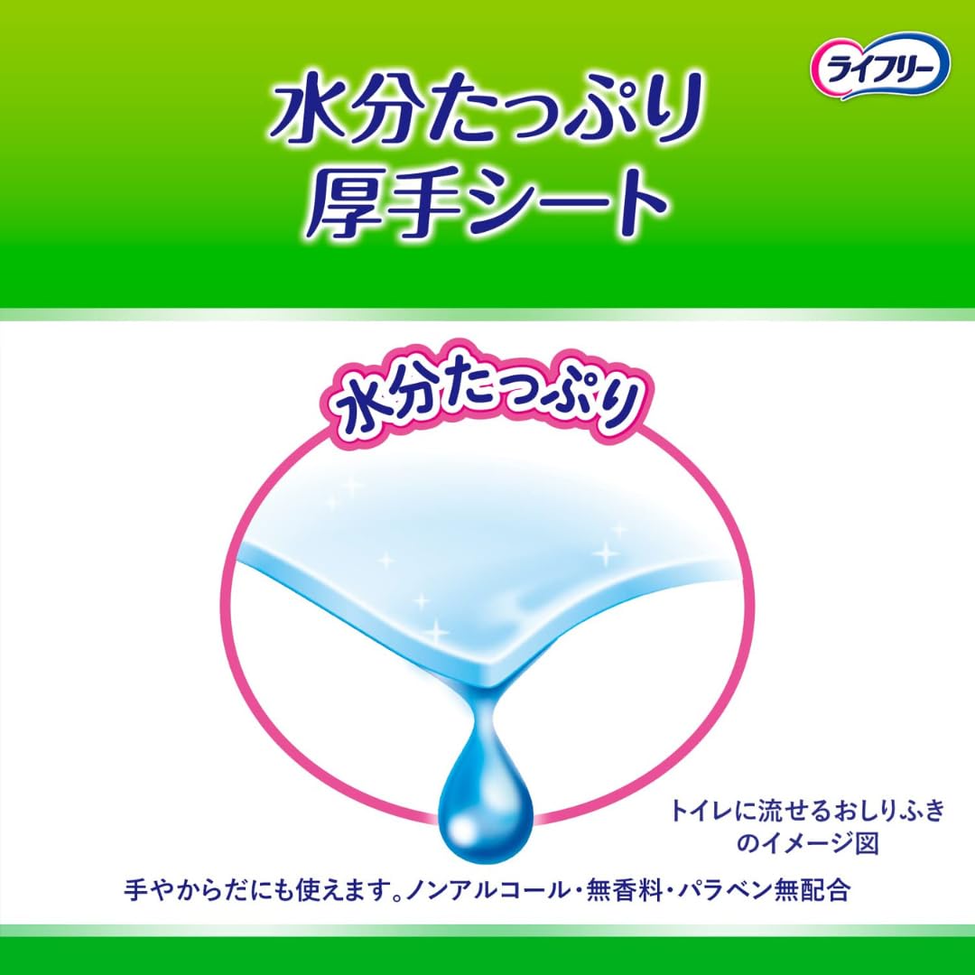 ●ライフリー 大人用おしりふき トイレに流せる 72枚 × 4袋 合計288枚。 ●厚手素材でしっかり拭ける トイレに流せるタイプのおしりふきです。 ●繊維のスキマの少ない厚手素材を採用したので、手を汚す心配も無くしっかり拭き取ることができます。 ●水解性なので、使用後はトイレに流せて後処理簡単です。 ●あけ口は、ラインまで引っぱって開けると、シールが戻らない「ピタッとシール(R)」を採用。急いでいても取り出し簡単です。 ●ノンアルコール・無香料・パラベン無配合。 ●手や体にも使えます。 ●シートサイズ:180mm×195mm