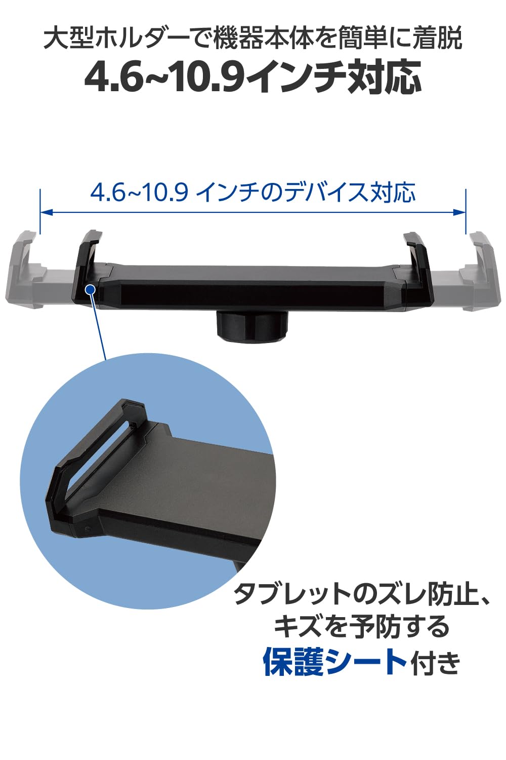 4.6インチ~10.9インチのタブレット・スマートフォン対応の大型ホルダーで、機器本体を簡単に着脱できます。