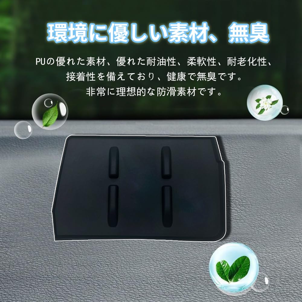 3.簡単な取り付け:専用設計で、取り付けが簡単です。工具は不要で、滑り止めマットを前方運転席のダッシュボードに置いて貼り付けるだけで完璧にフィットします。背面には3M接着剤が付いており、気温が15度以下の場合は加熱してから貼り付けてください。しっかり固定され、滑りにくいです。