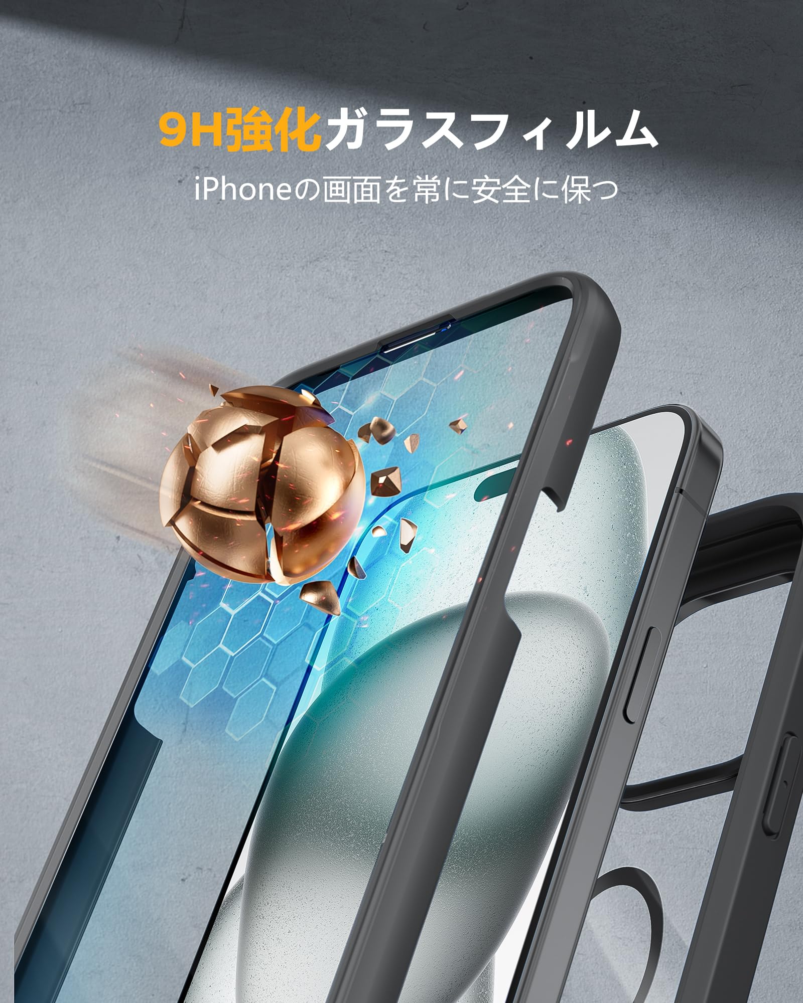 Miracase iPhone15 用 ケース MagSafe対応 9H 強化ガラス 360°保護 スマホケース iPhone15 用 カバー 全身バンパー保護ケース 6.1インチ フルカバー ワイヤレス充電対応 マグセーフ対応 マグネット搭載 黒