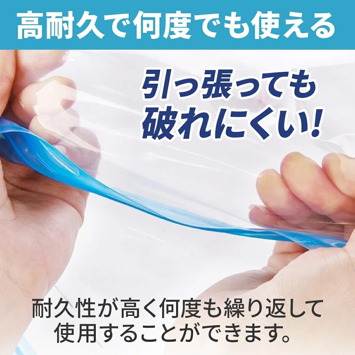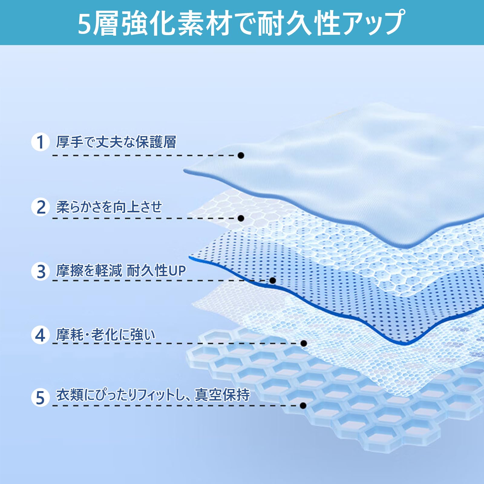 ??【7ミクロンの厚さで40%強化!】 圧縮袋には高耐久性のあるPA/PE素材を採用。この素材は、引張強度と耐久性に優れ、使用中の破れや空気漏れを効果的に防ぎます。本製品は7ミクロン(7si)で、市場によく見られるPET/PE素材や5ミクロン厚の圧縮袋と比べて約40%厚く、より頑丈で長期間安心して使えます。