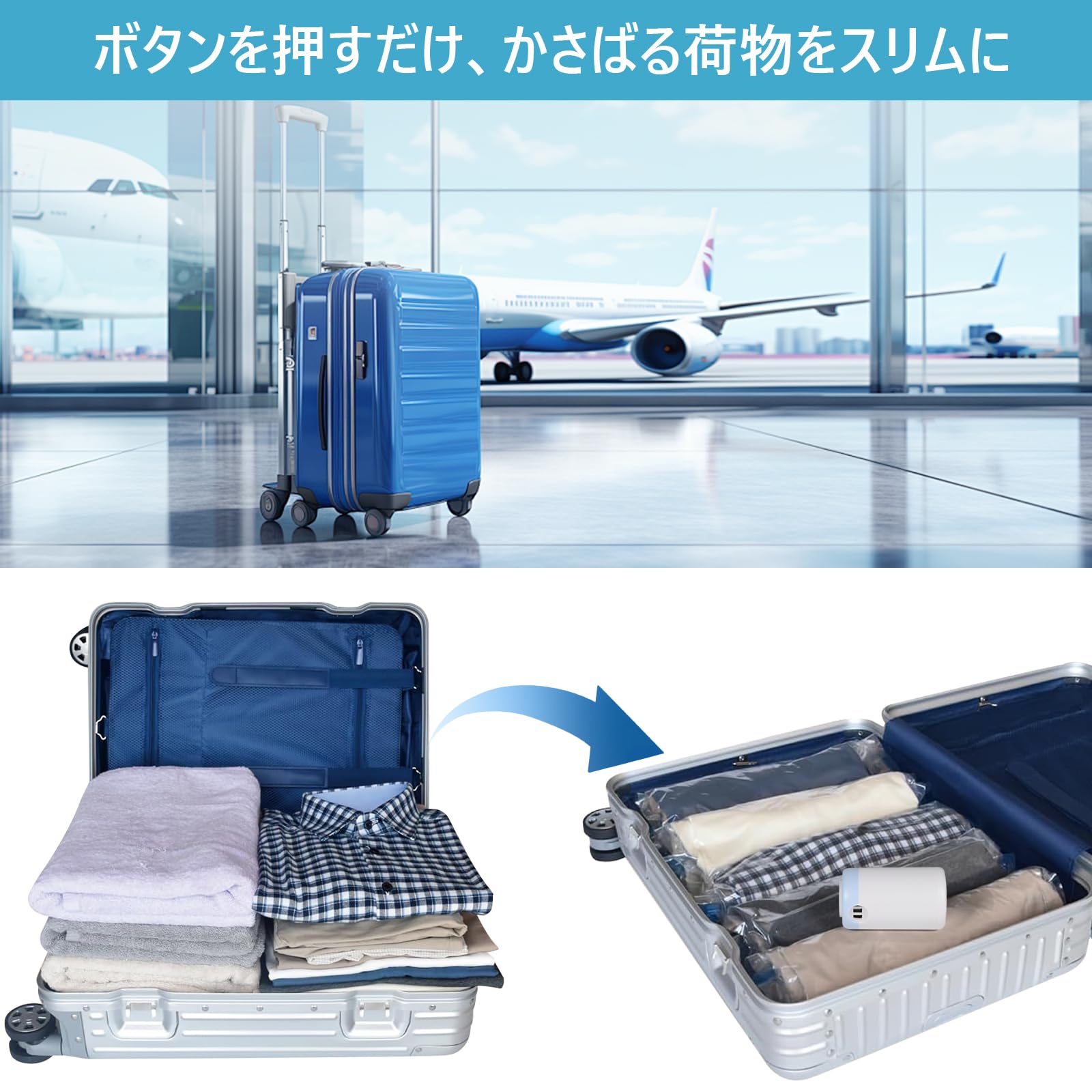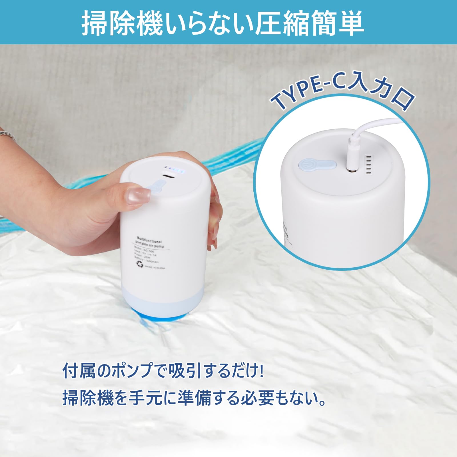 ??【147gの軽量設計で持ち運びラクラク!】 掃除機を使わず、充電式コードレスデザインでどこでも簡単に使用可能。圧縮ポンプはわずか147gとスマートフォン並みの軽量設計で、旅行や引っ越しにも便利です。