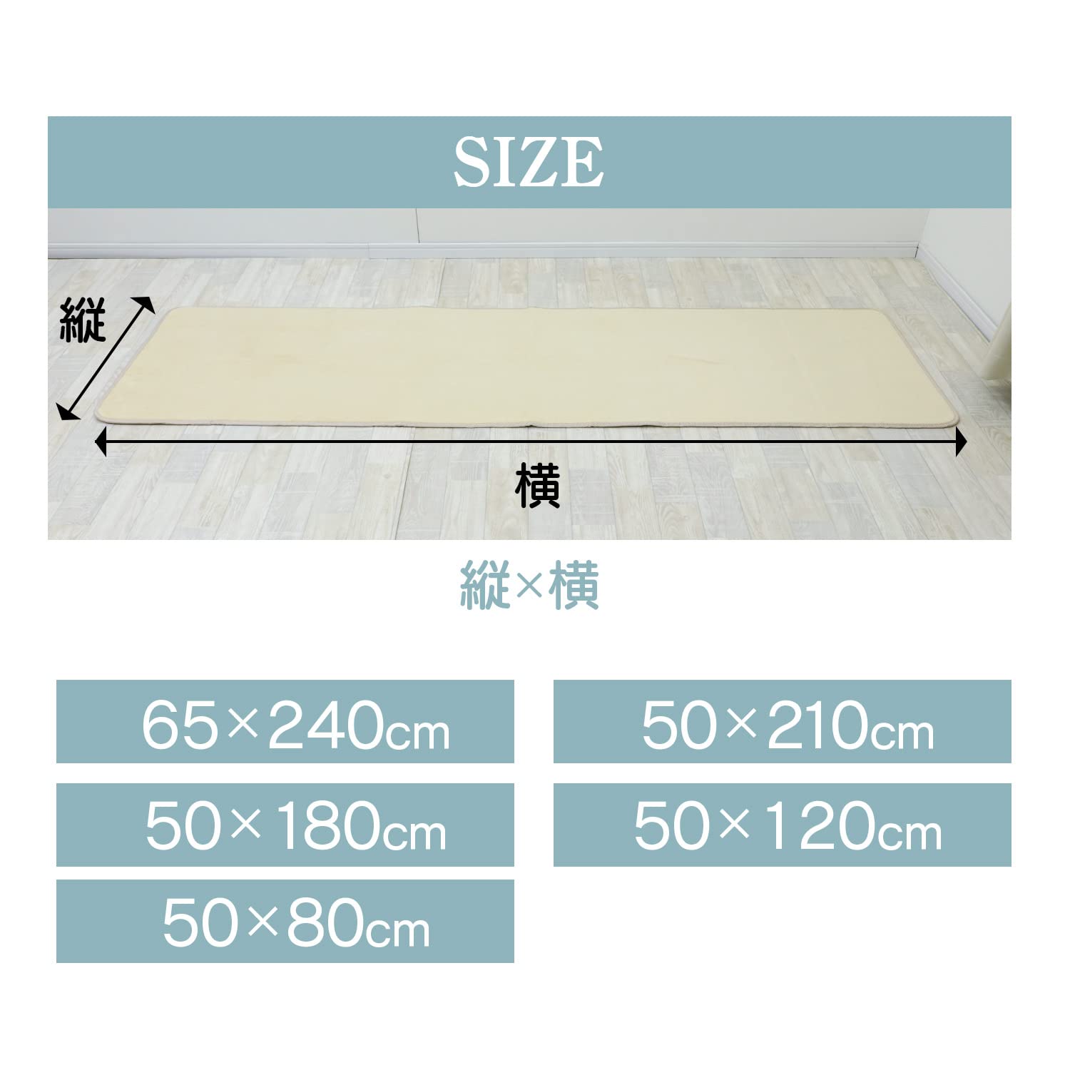 サイズ:50×180cm 表地:ポリエステル100% パイル長さ:約5mm 中材:ウレタンフォーム約8mm 裏面:不織布(滑り止め加工)
