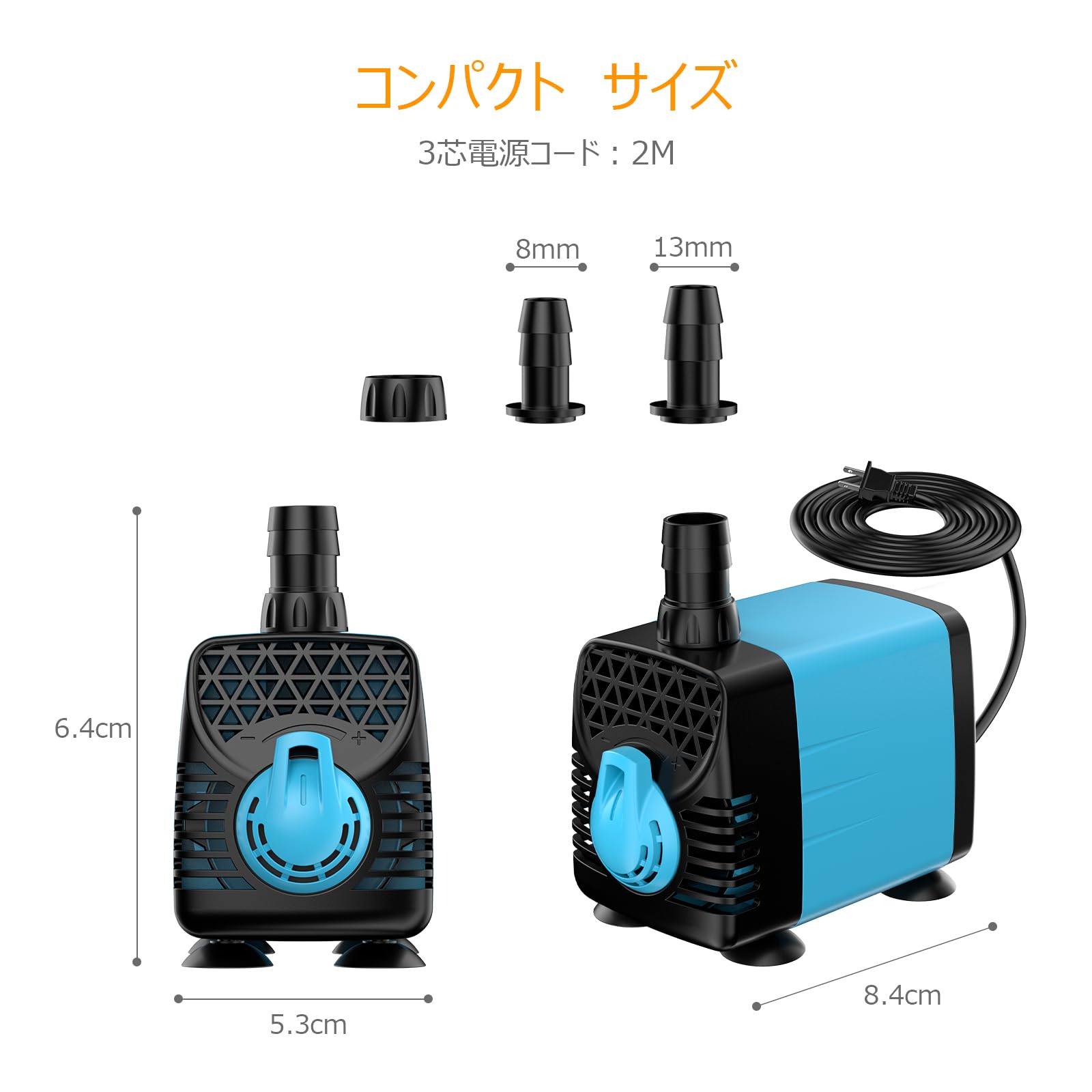 ??【水中ポンプの仕様】◇入力電圧:AC 110V/60Hz ◇電力:20W ◇最大揚程:1.6Mぐらい ◇吐き出し口外径:8mm&13mm ◇最大流量:160GPH ◇騒音クラス:40デシベル以下 ◇電源コードの長さ:1.5M