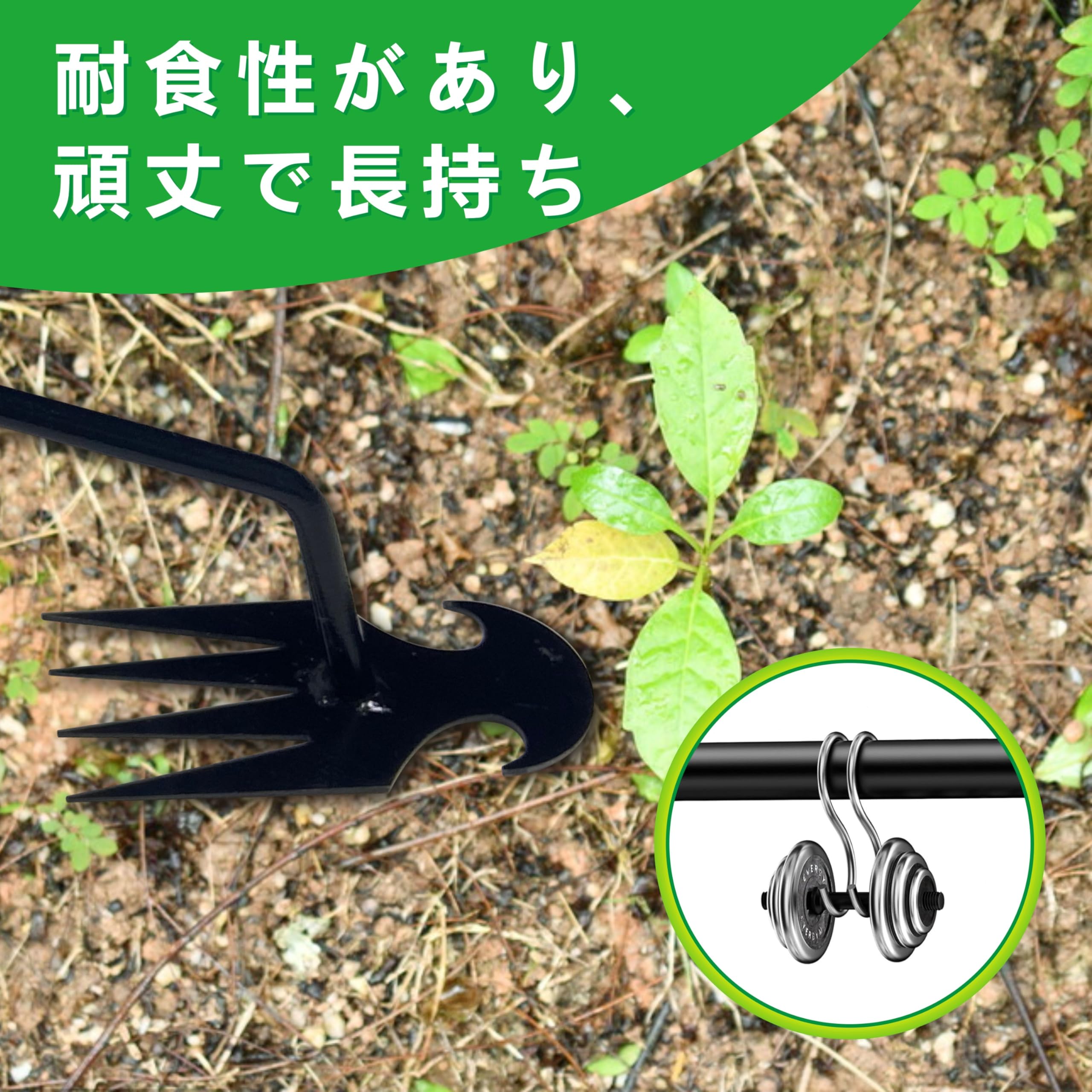 【両用除草ツール】4本歯と先の鋭利な刃との2in1で、深めの雑草や根を切ったりしつつ、引っこ抜く作業もとてもしやすく、使いやすいです。 4本の鋭い歯を草の根元にできるだけ近い土に差し込んで引っ張るだけです。また、刃先を地面に差し込み、そのまま持ち上ける事で草が抜けます。葉が放射線状に広がっている雑草を抜く際に効率的です。