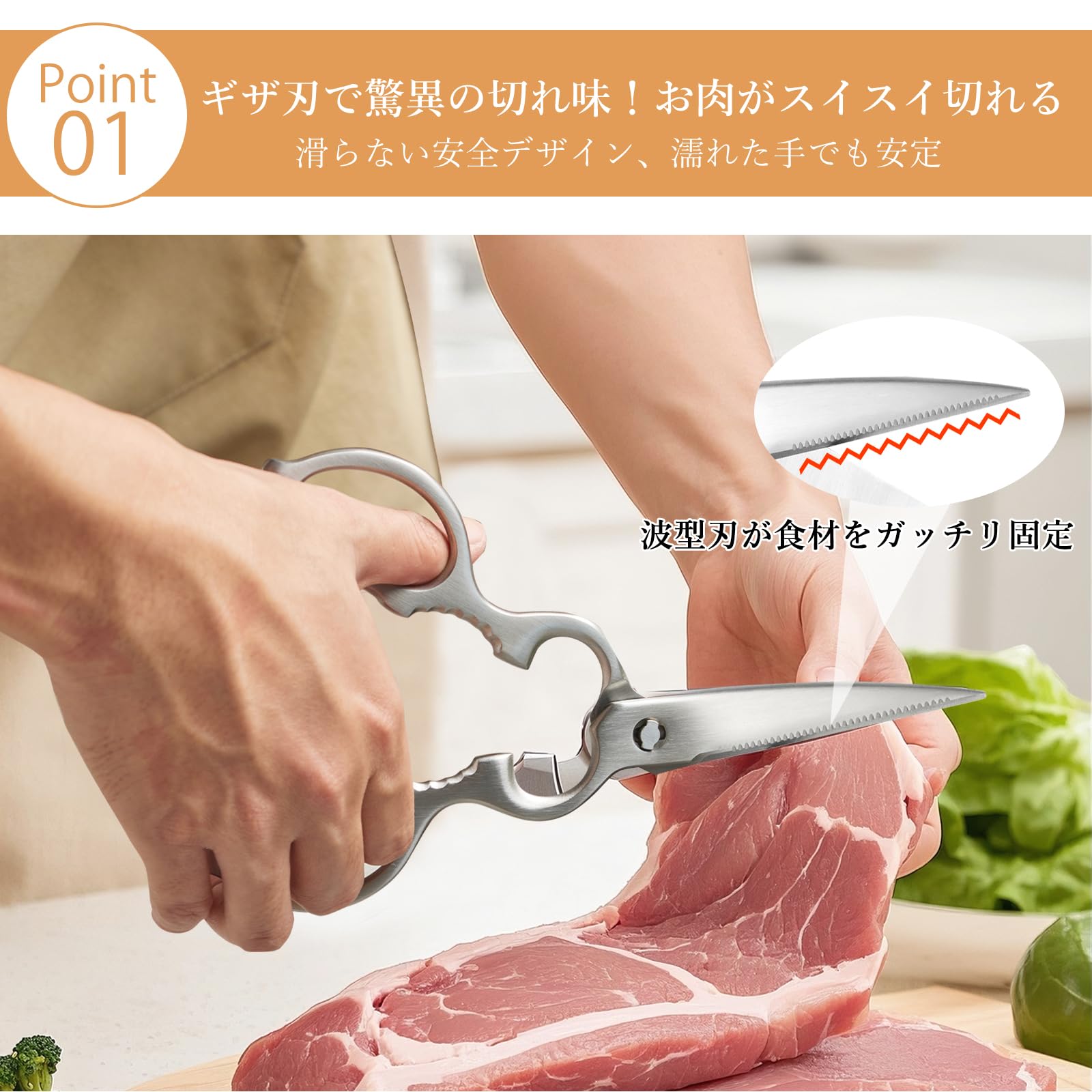 【多機能ハサミ】このキッチンバサミは、耐久性と実用性を兼ね備えたマルチツールです。肉の切り分け、鶏の骨の切断、栓抜き、ネギの細切り、硬い骨の挟み取り、くるみの割り、蓋の開け閉めなど、さまざまなシーンに対応できます。