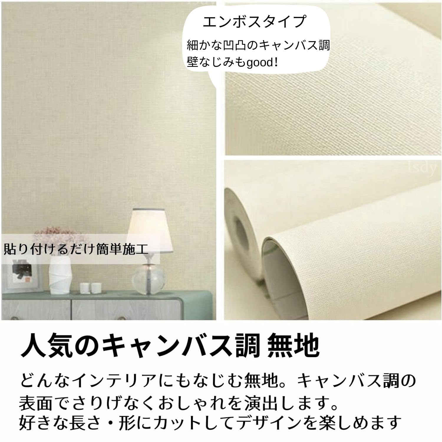 【Isdy 無地 壁紙シート】幅45cm×長さ10m ×0.1mm 色・柄: 白系(オフホワイト)・無地(キャンバス調)