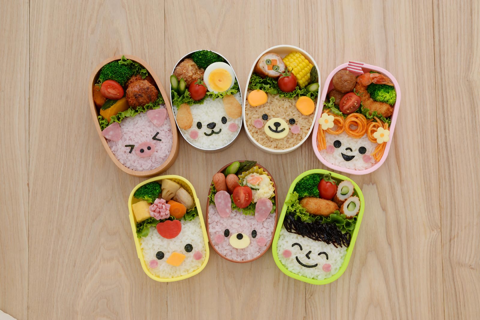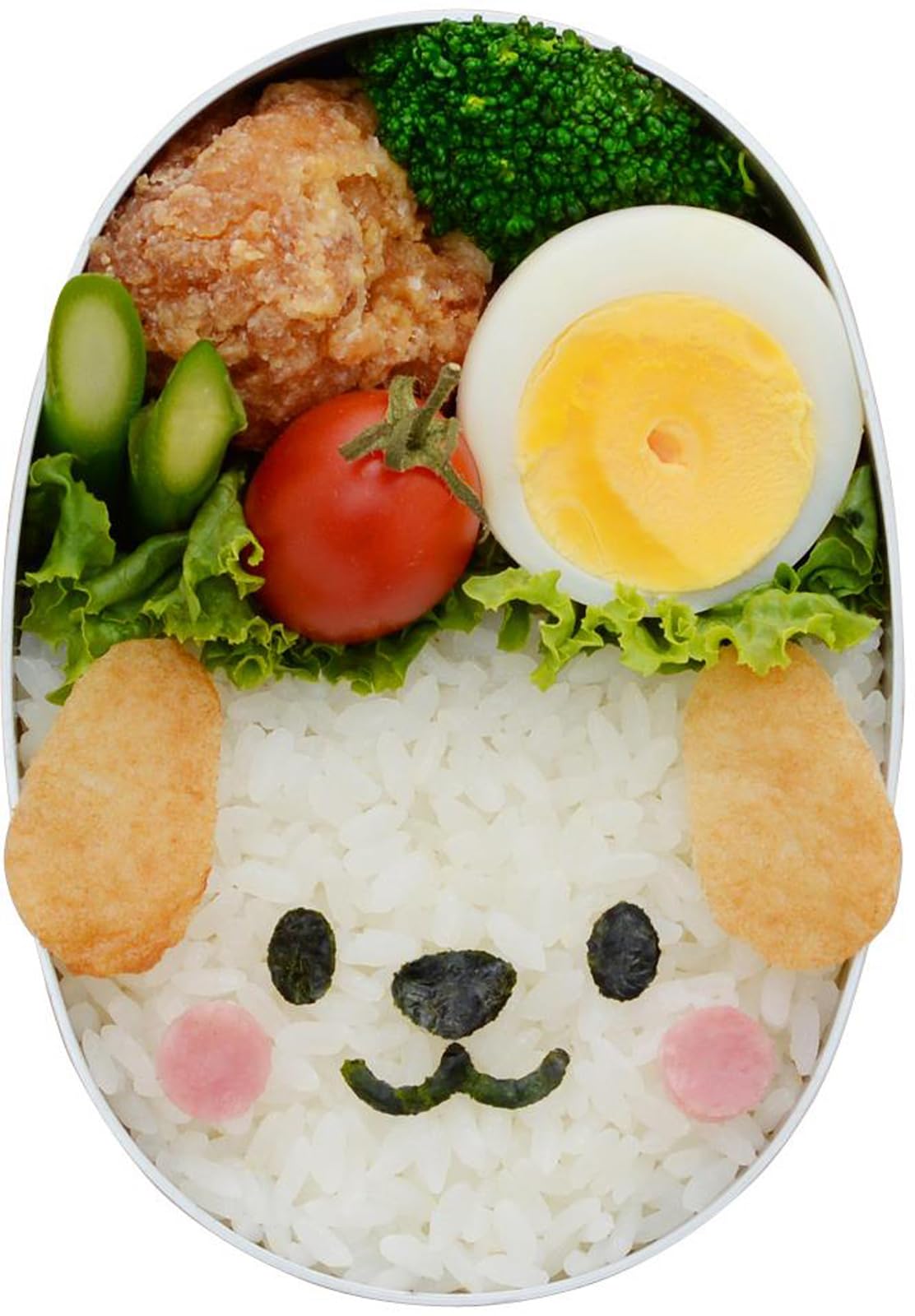 食材カッター大・小、海苔カッター、カッターマットがセットになった商品です。お弁当箱の半分にご飯を詰めて、そこに食材や海苔を飾り付けるだけで簡単におかおごはんができます。組み合わせていろんな動物や人の顔を作ることができます。お弁当のご飯だけでなく、パンなどにも飾り付けできます。●セット内容:食材カッター小、食材カッター大、海苔カッター、カッターマット、取扱説明(台紙に記載)