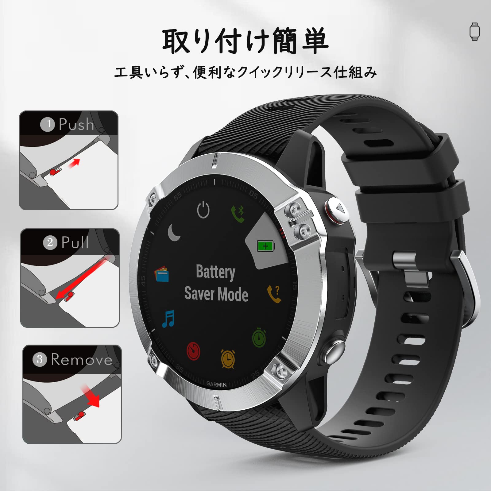 「取り付け簡単」工具なしで取り付け、取り外しができる非常に便利なクイックリリース取り付け仕様となっております。ウォッチ本体と合わせて取り付けすれば、簡単に交換できます。安定性が高めたステンレス製の留めバックルとダブル遊革の仕様よりスポーツの最中でも腕にしっかりと固定して装着できます。
