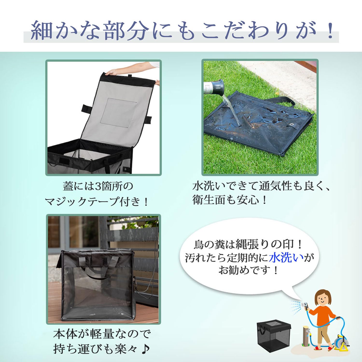 【使用素材は強度抜群】 ゴミ出しは毎週、種類によっては毎日のように外に出して使用するごみステーションボックスになります。 長くご使用いただく為にも、シート部分にはPVCレザーを使用。 伸縮性と撥水性に優れており、何度折り畳みしても畳みシワがつきにくく、雨の日でも 安心して継続的にご使用いただけます。 また、網目は約1mm以下のメッシュ形状で細かく、小さな虫の侵入や、鳥のクチバシも入らないのでより安心してご使用いただけます。