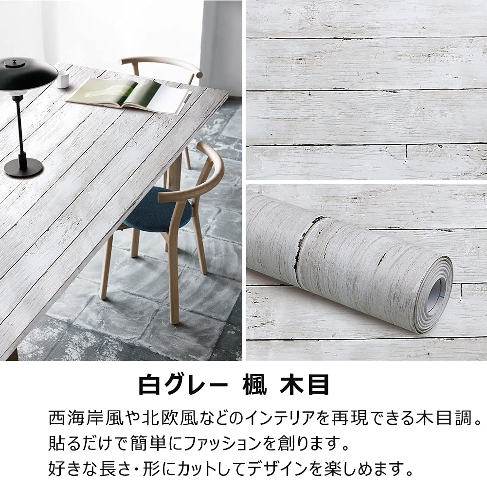 壁紙シール はがせる おしゃれ 壁紙 厚手 リメイク リフォーム カッティング シート ウォール ステッカー 木目調 長さ10m 壁紙 (白グレー 楓 木目)