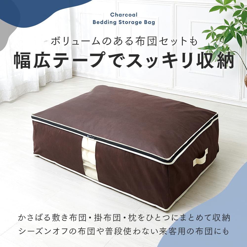 炭加工シートを挟んだ3層構造収納ケースで、気になる汗のニオイ・加齢臭を消臭!敷き布団・掛ふとん・枕をまとめて収納!幅広テープでスッキリ簡単収納!透明窓から中身が見える。普段使わない来客用の布団にも。※炭加工シートは底面に使用しております。