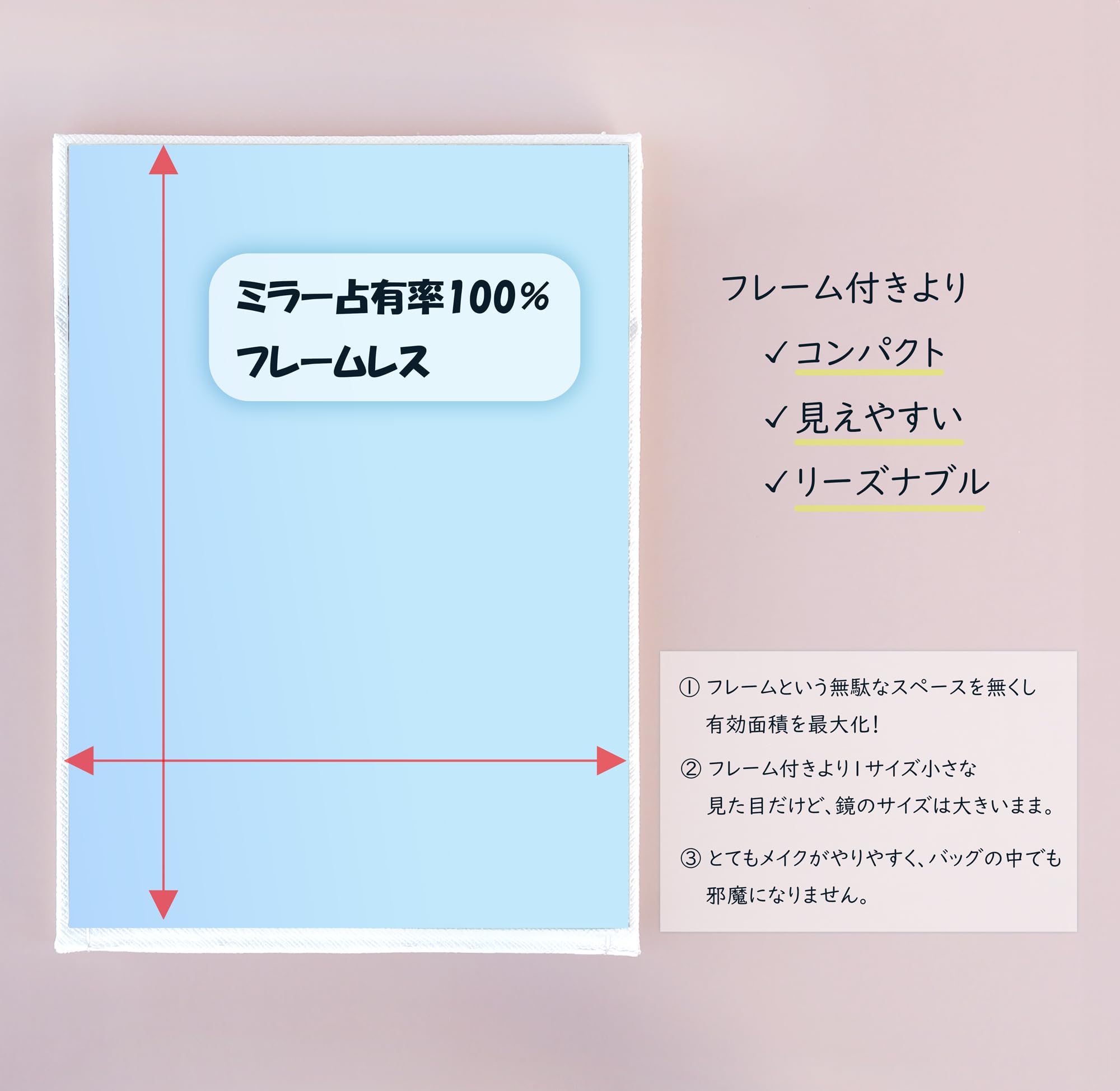【フレームレス】ミラーの縁にフレームは一切ありません。ミラー占有率100%が誇る最高の映りをご体験ください。フレーム付きミラーと比べ、1ランク小さい本体でも映り面積は同等となっており持ち運びやすさにも貢献いたします。
