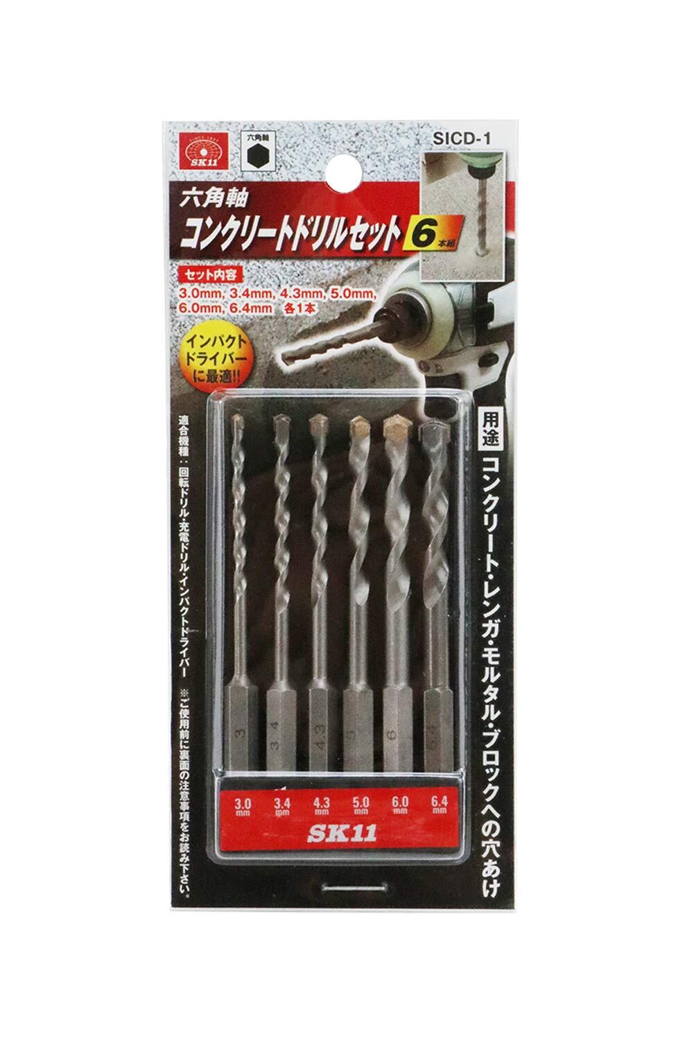 【数量限定】SK11(エスケー11) 六角軸 コンクリートドリルセット 6本組 3.0・3.4・4.3・5.0・6.0・6.4mm SICD-1