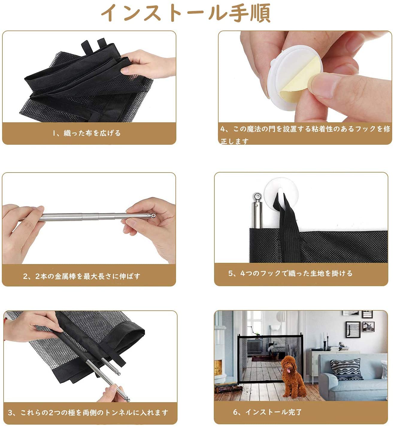 製品内容:ペット犬フェンス*1;メタルポール*2;スティッキーフック*4 。インストール用のすべてが含まれています。ツールは必要ありません。このセットには、簡単に取り付けるためのコンポーネントペットゲートを金属ゲートよりもはるかに簡単に設置できます。