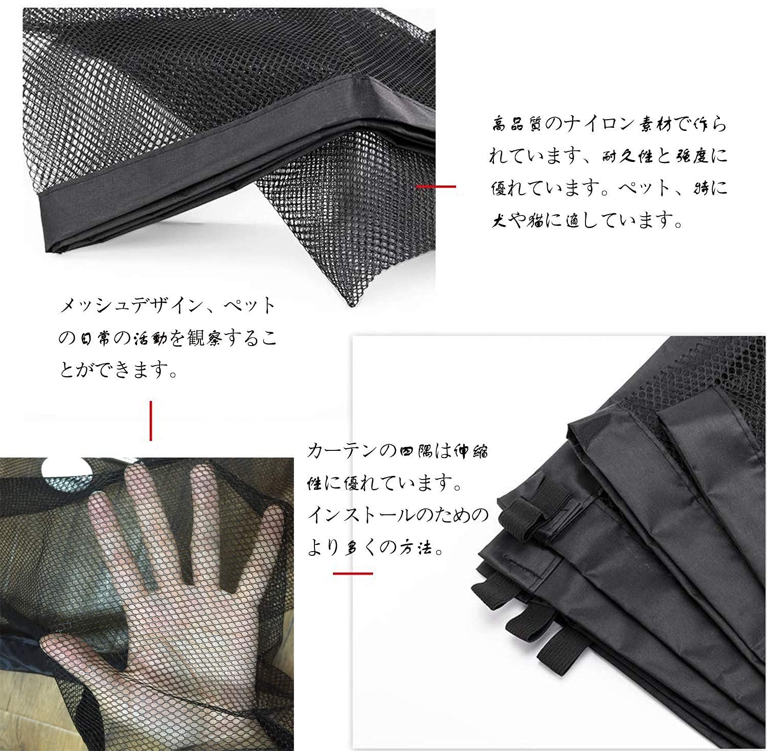 【取り付けが簡単】金属製のバリアとは異なり、フックや調整可能なストリップが付いたペットメッシュバリアは、工具を必要とせずに簡単に組み立てることができます。ドアの上のハンドルまたは前部座席のヘッドレストに取り付けることができます。折りたたんできれいにするのも簡単です。