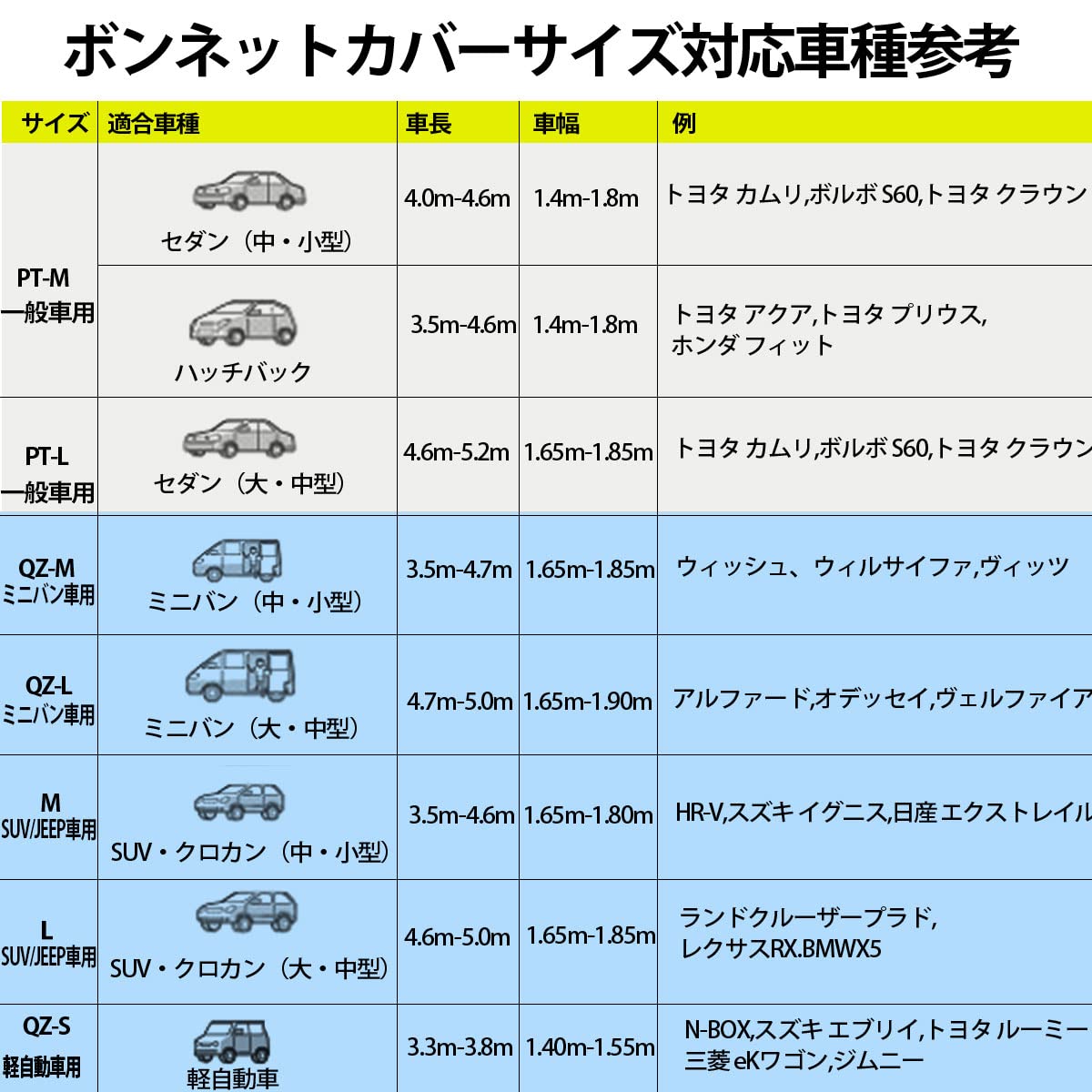 【適合サイズ】乗用車タイプの車長3.50m~4.60m/車幅1.65m~1.80mクラスの汎用、そのような場合は、ドアミラーに掛ける長さでフィット調整してください。