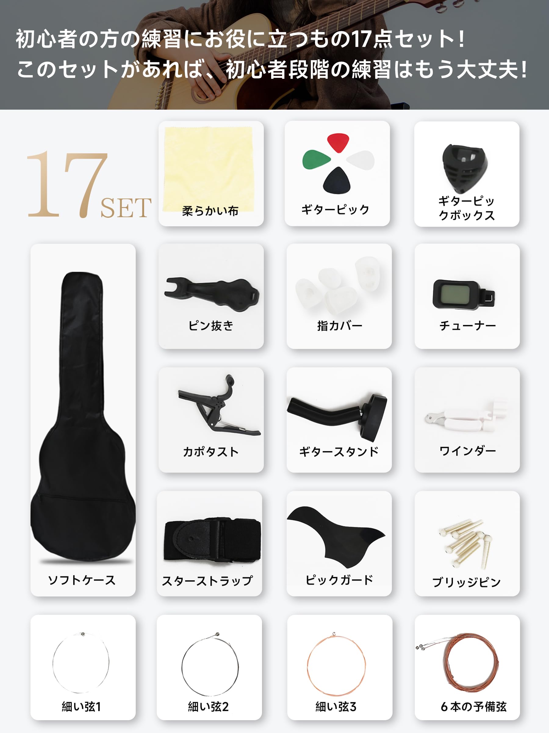 「初心者段階のギター練習にぴったりな17点セット」ソフトケース、ピン抜き、指カバー、チューナー、カポタスト、ギタースタンド、ワインダー、ギターピックボックス、ブリッジピン、ストラップ、ピックガード、ギターピック、細い弦1、細い弦2、細い弦3、6本の交換用弦の、17点の初心者にピッタリな道具が大揃い!初心者段階の練習は、もう大丈夫です!思い切って、練習しましょう!